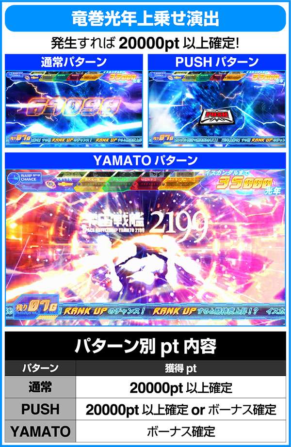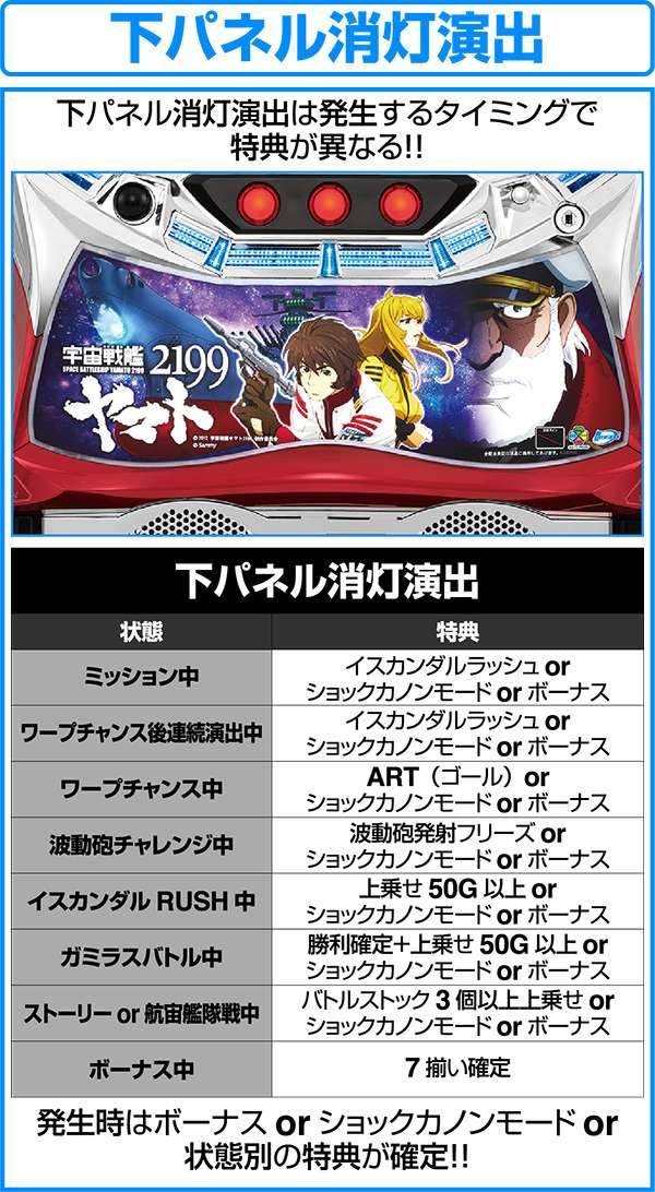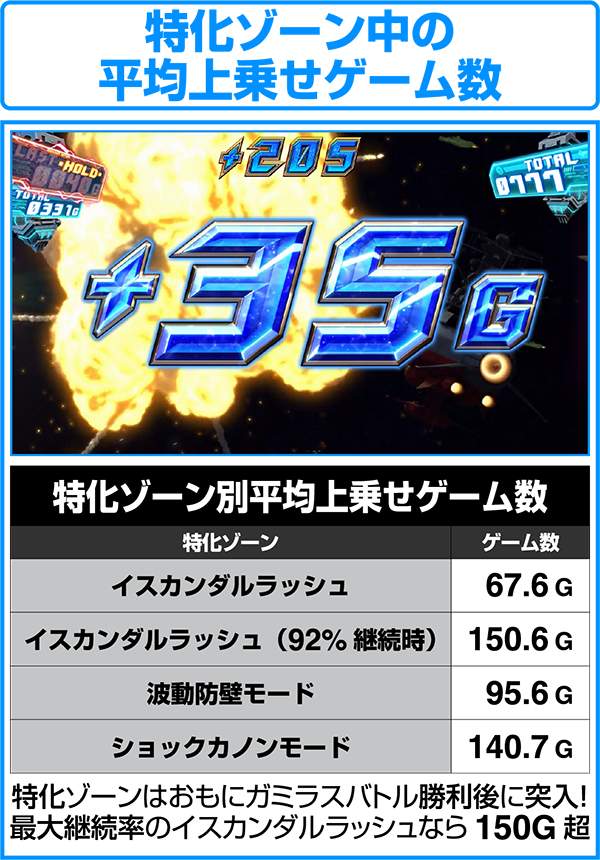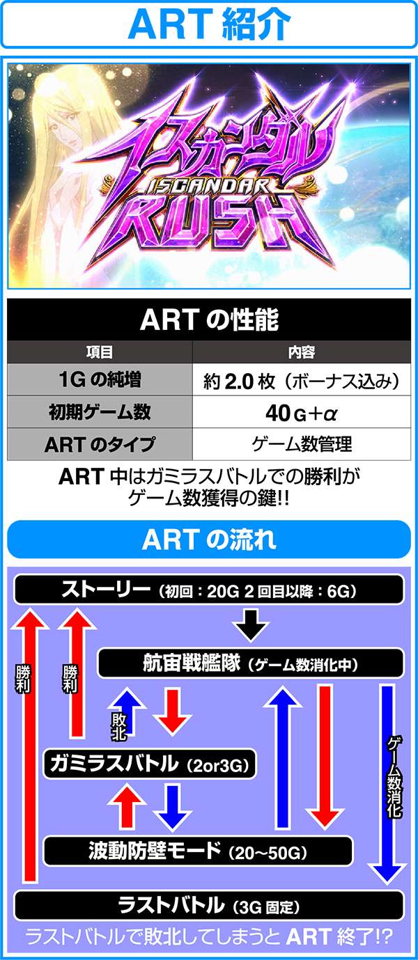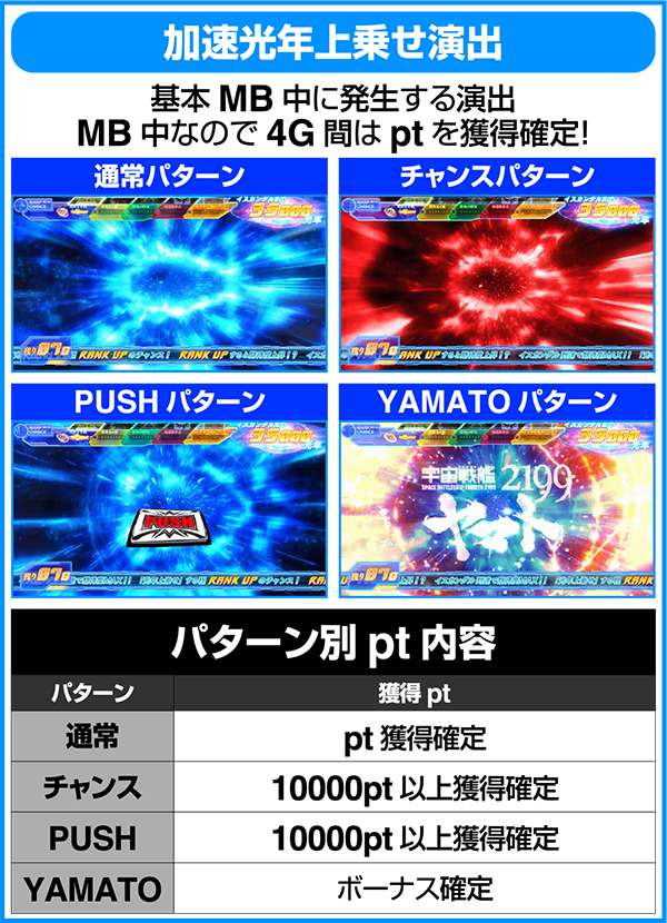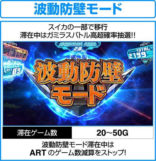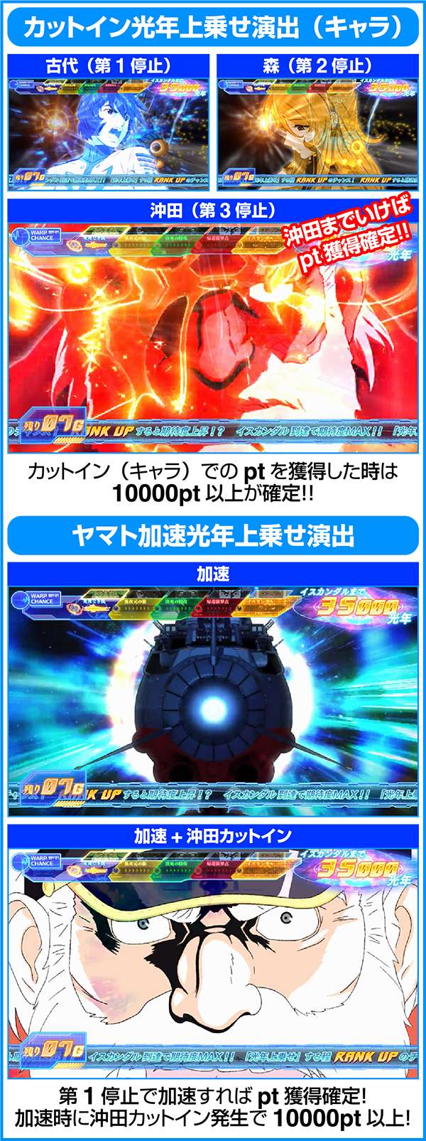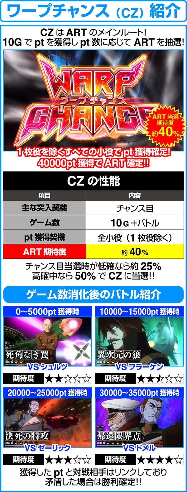 10G間は毎ゲーム小役(1枚役を除く)に応じてpt(光年)を獲得。獲得時の最低ptは5000となっており、40000pt獲得できればバトルを経由せずに、ART以上が確定する「イスカンダルCHANCE」を獲得できる。