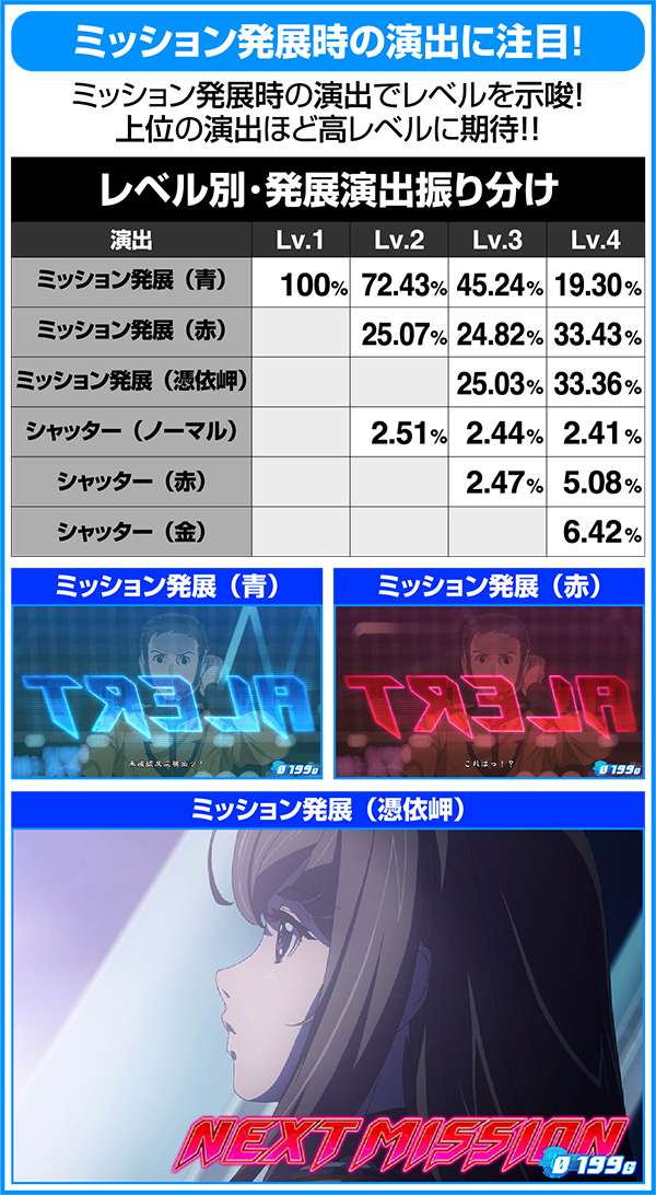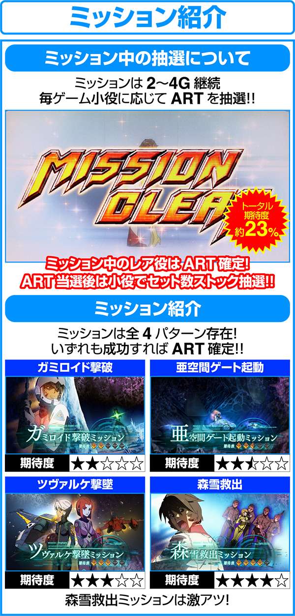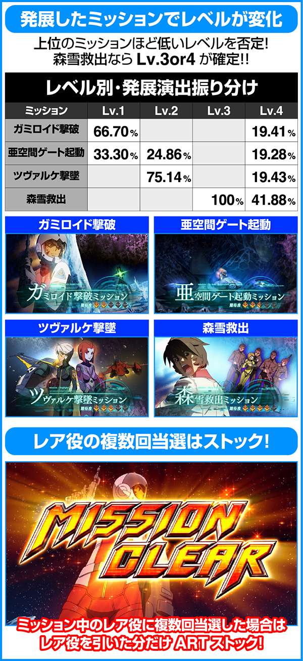 また、ミッションには4つのレベルが存在し、ミッションの種類でレベルを示唆しており、ミッション中のレア役以外でのART当選期待度が異なる。レベル4の場合は小役に関わらずART確定となっている。