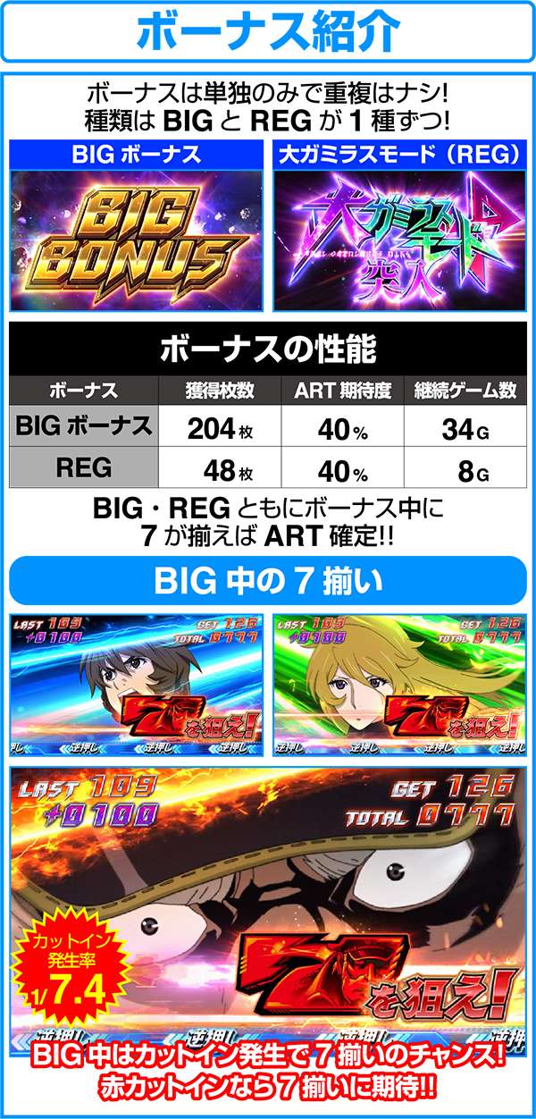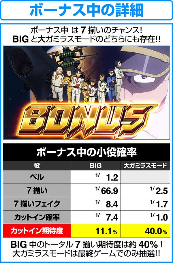ボーナスはBIGと大ガミラスモード(REG)の2種類が存在。BIG中はカットイン発生時に7が揃えばART確定、ART中ならゲーム数上乗せとなる。大ガミラスモードはボーナスの最終ゲームで7揃いのカットインが発生し、7が揃えばART確定+イスカンダルCHANCE。ART中なら3桁上乗せが確定する。
