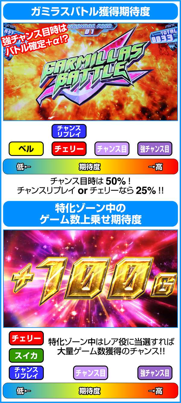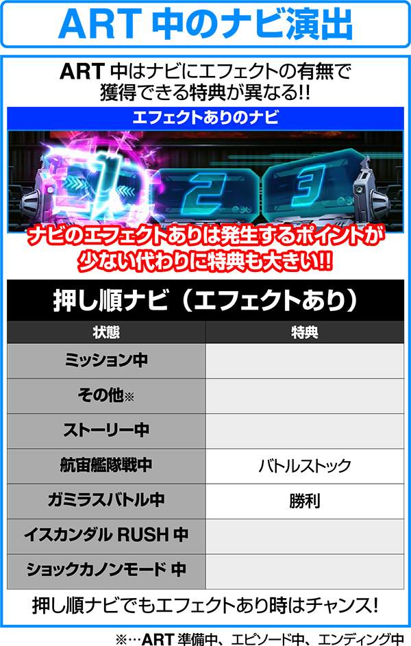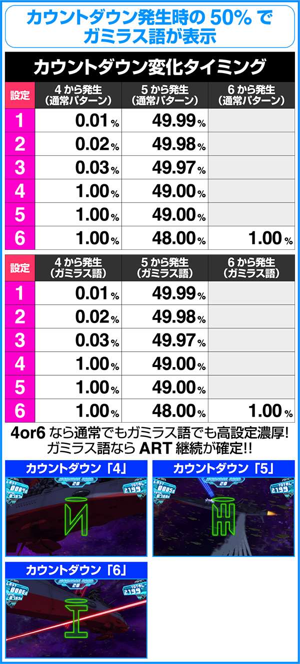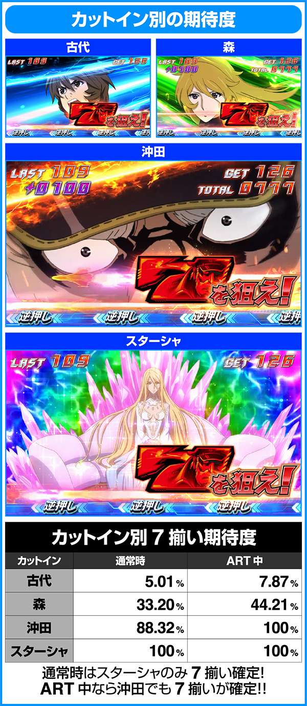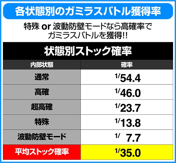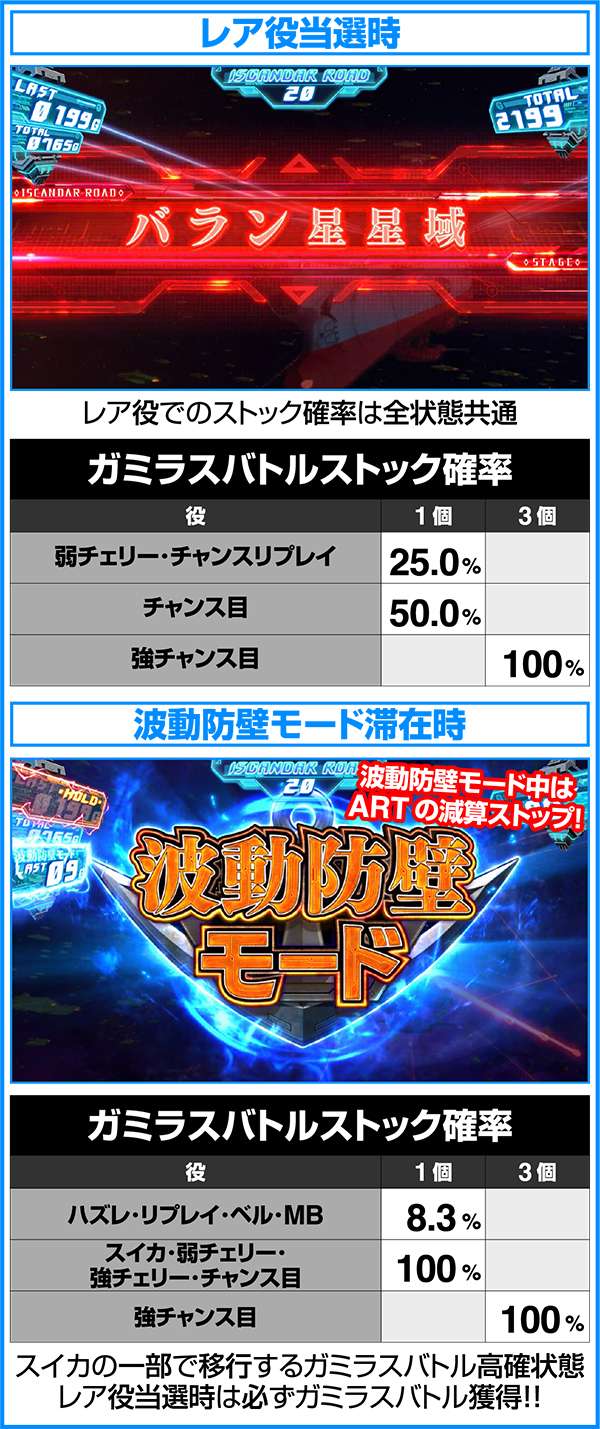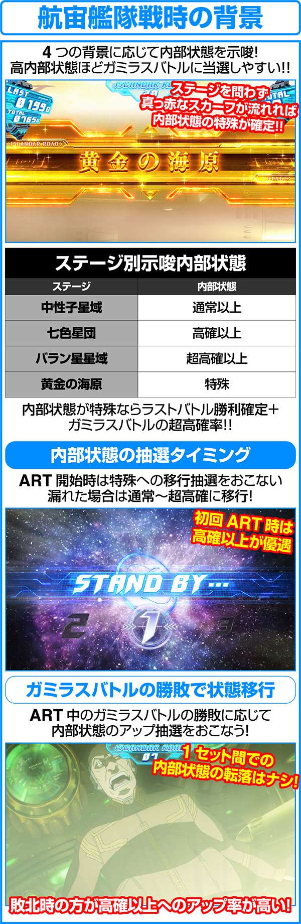また、ART中の内部状態は突入時だけでなくガミラスバトルの勝敗に応じても抽選。さらに、セット内での内部状態の転落はなく、ガミラスバトルをおこなうほど、内部状態のアップ抽選をおこなえる。