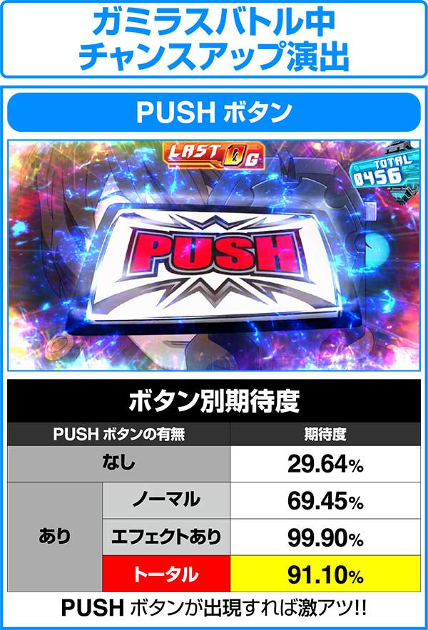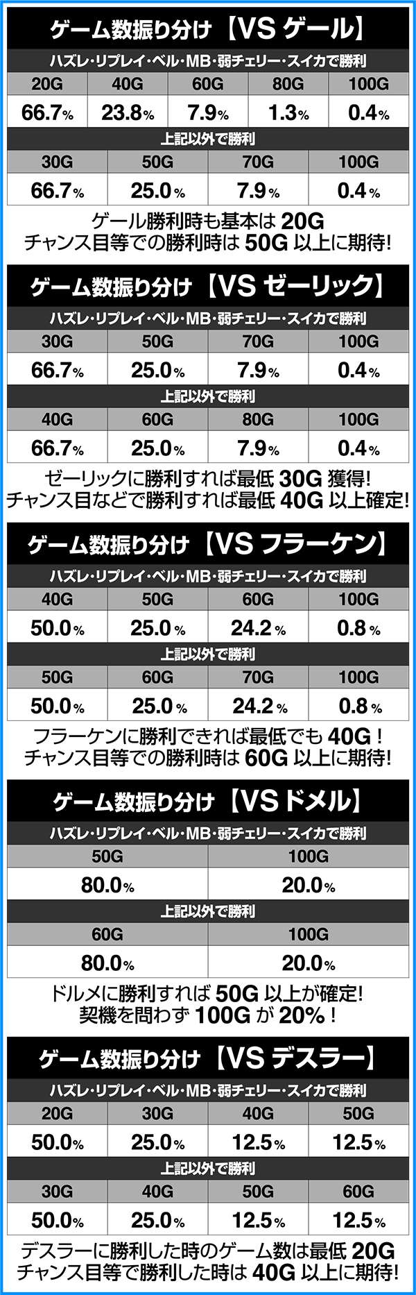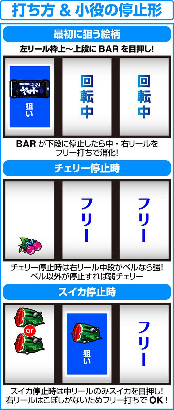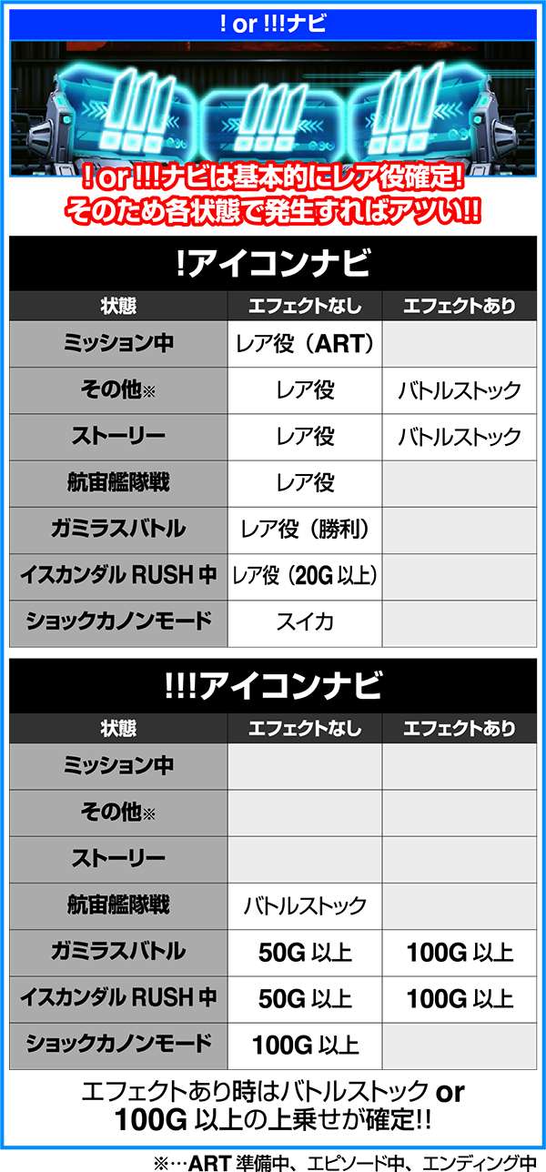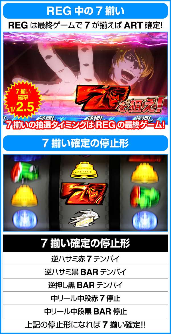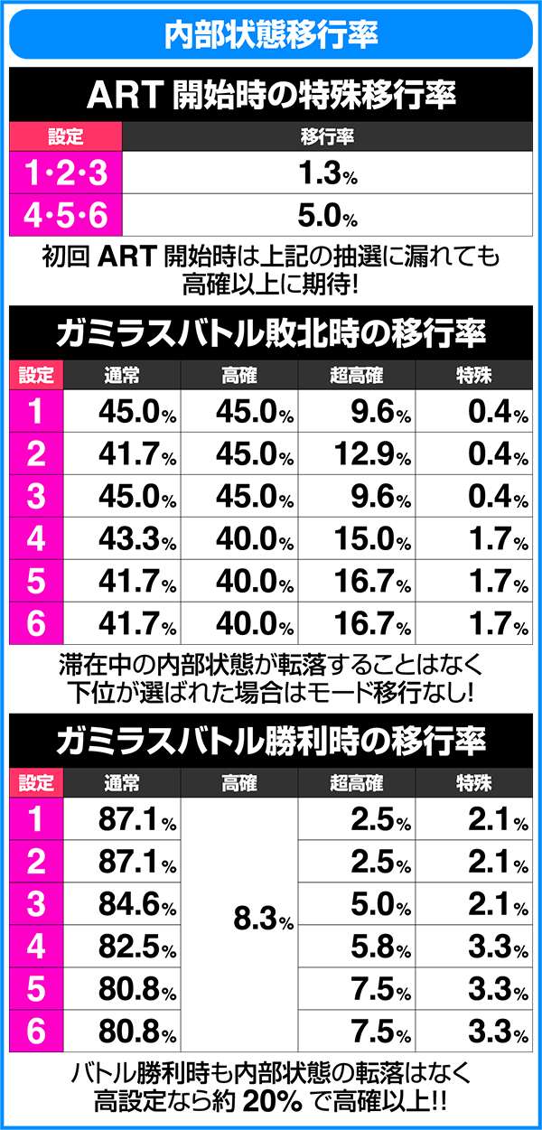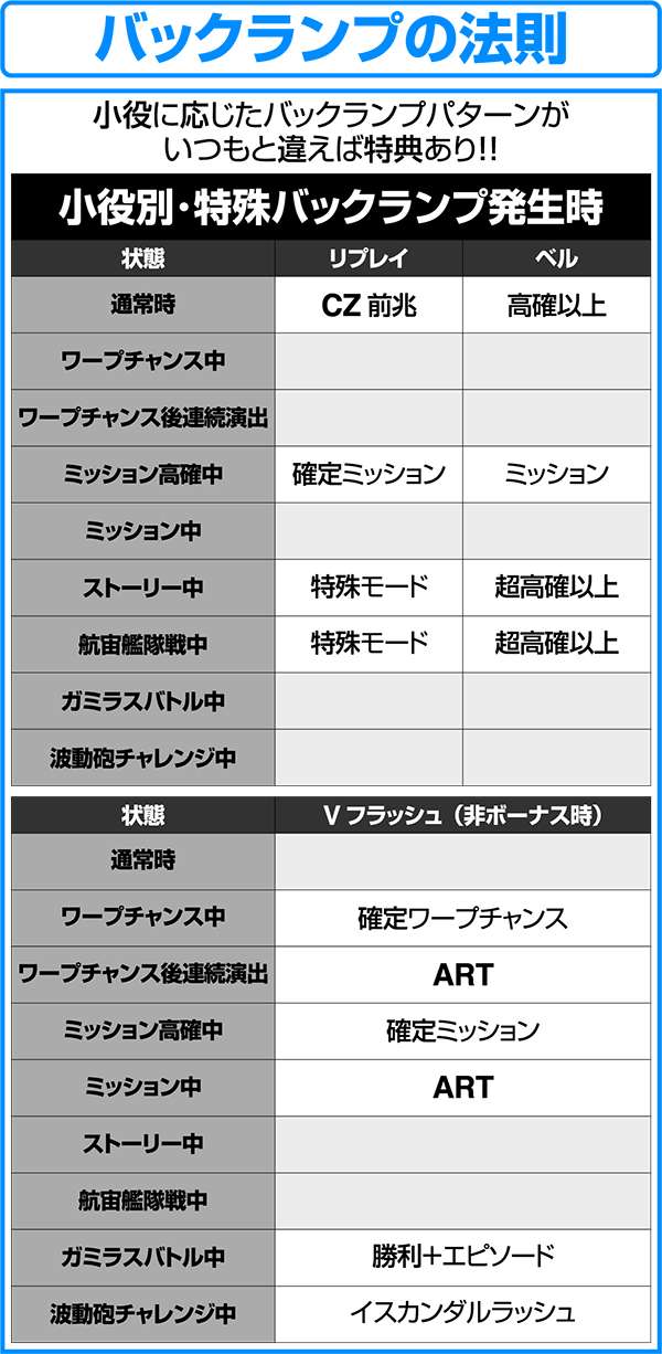 また、ART中の内部状態は突入時だけでなくガミラスバトルの勝敗に応じても抽選。さらに、セット内での内部状態の転落はなく、ガミラスバトルをおこなうほど、内部状態のアップ抽選をおこなえる。