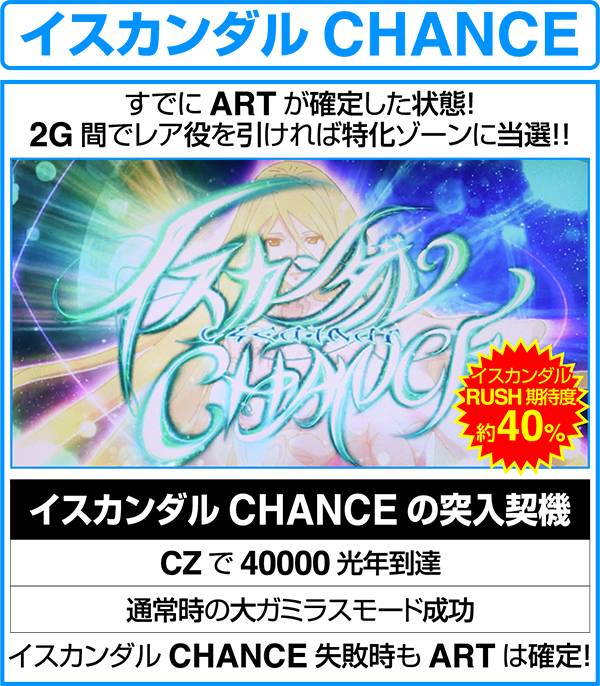 イスカンダルCHANCEはCZで40000光年到達や通常時の大ガミラスモードでの7揃いなどのARTが確定した状態で発生する可能性がある。発生時は2G間での小役に応じて特化ゾーンのイスカンダルRUSHへの突入を抽選。