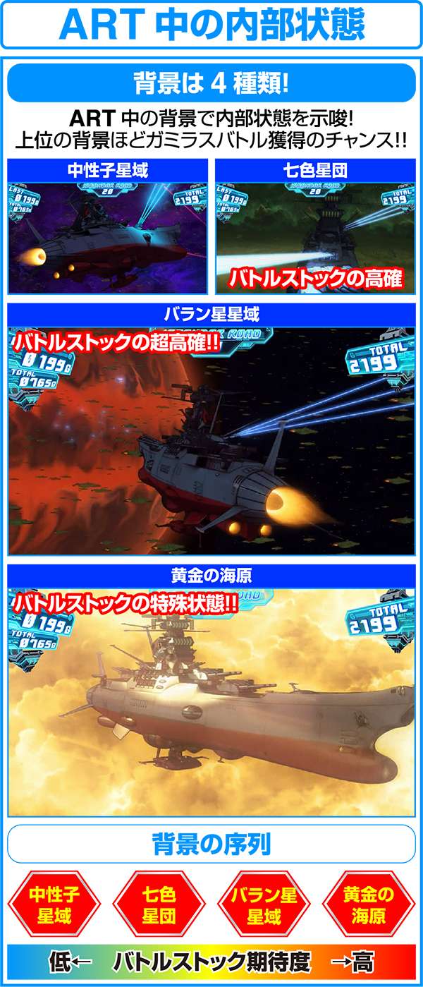 ART中の背景では内部状態を示唆しており、上位の内部状態ほどバトルストック(ガミラスバトル)の獲得期待度がアップする。