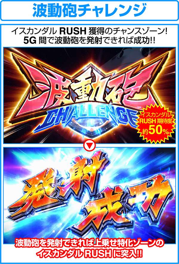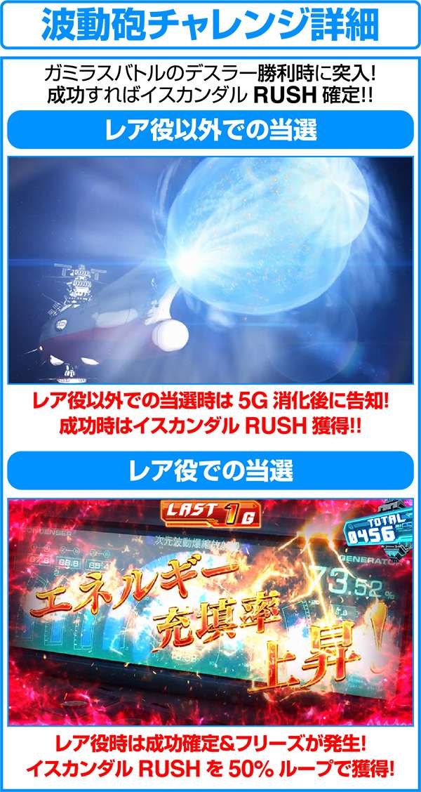 波動砲チャレンジの突入契機は、ストーリー回数が5の倍数の時に突入する。突入時は5G間でイスカンダルRUSHの獲得抽選をおこなっており、レア役を引けた場合は確定となる。