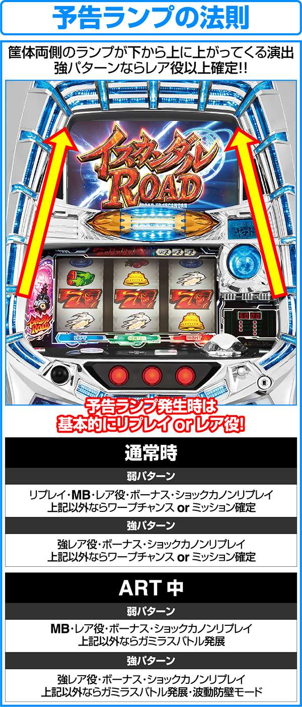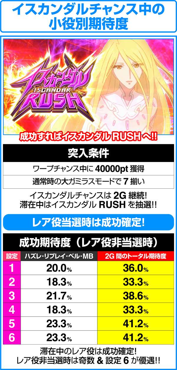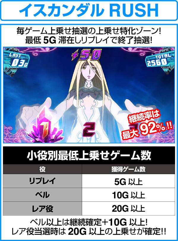 また、レア役当選時は、イスカンダルRUSHを50%ループで獲得するため、特化ゾーンを複数獲得できる大チャンスとなる。