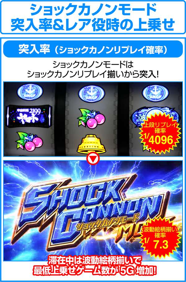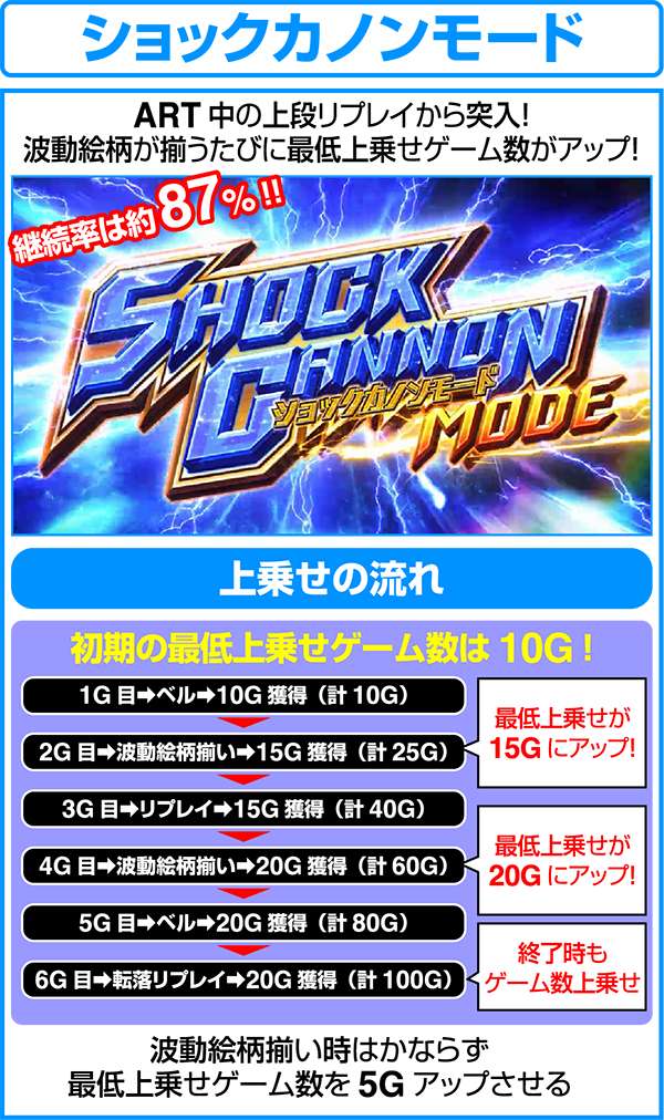 ショックカノンモードはART中の上段リプレイから突入するゲーム数上乗せ特化ゾーン。最低上乗せゲーム数(初期は10G)をアップさせながらゲーム数を獲得していく流れとなっている。