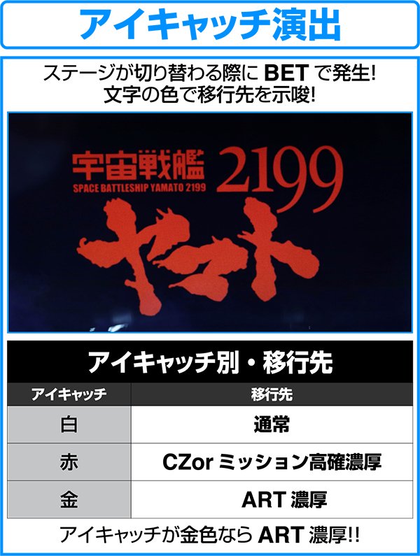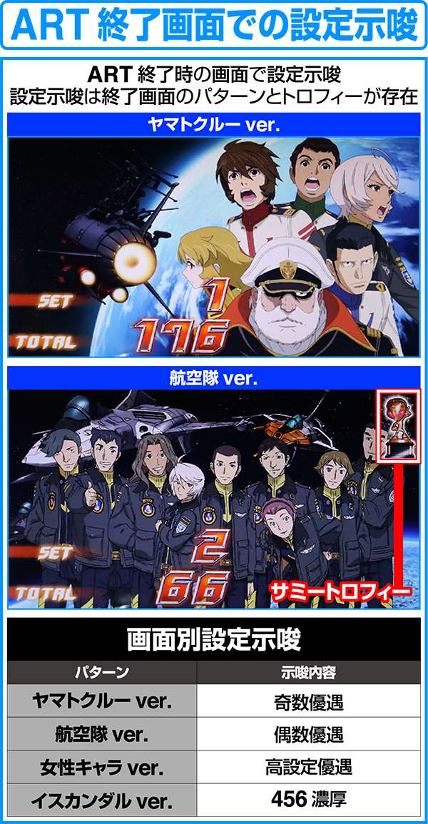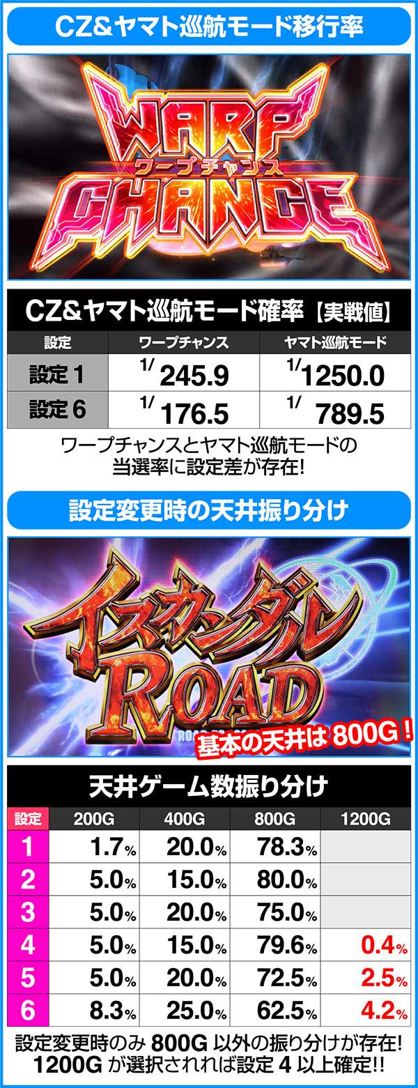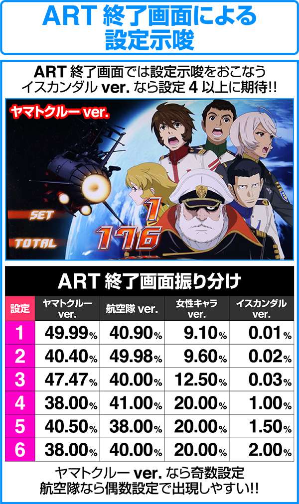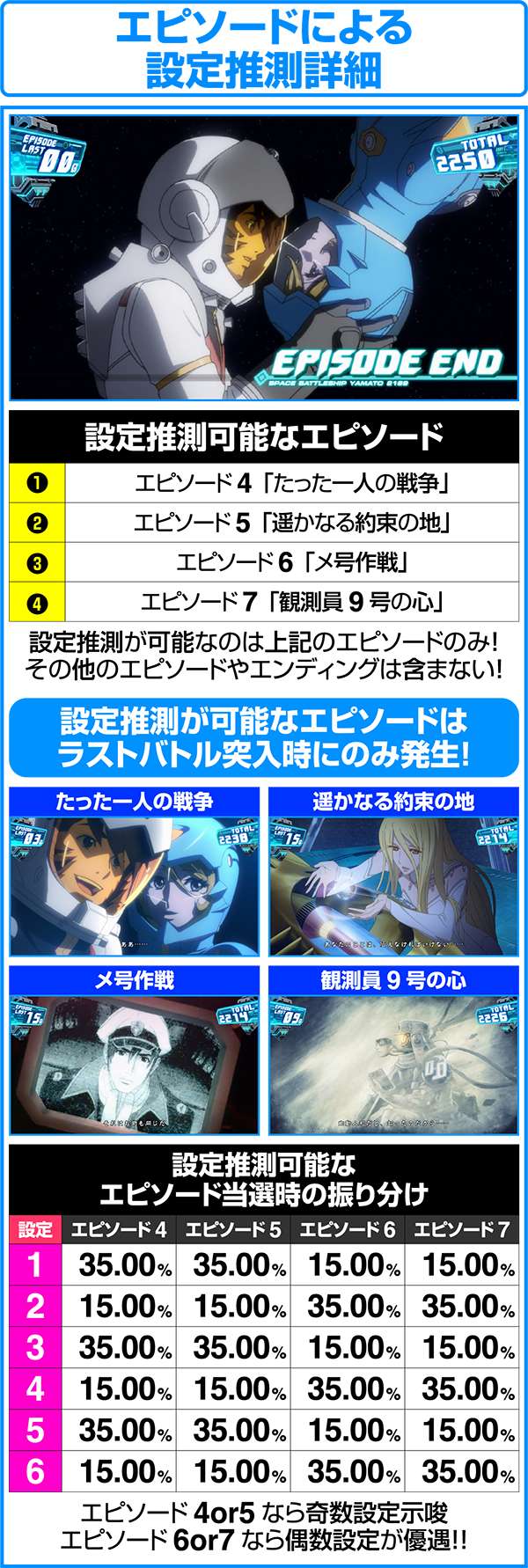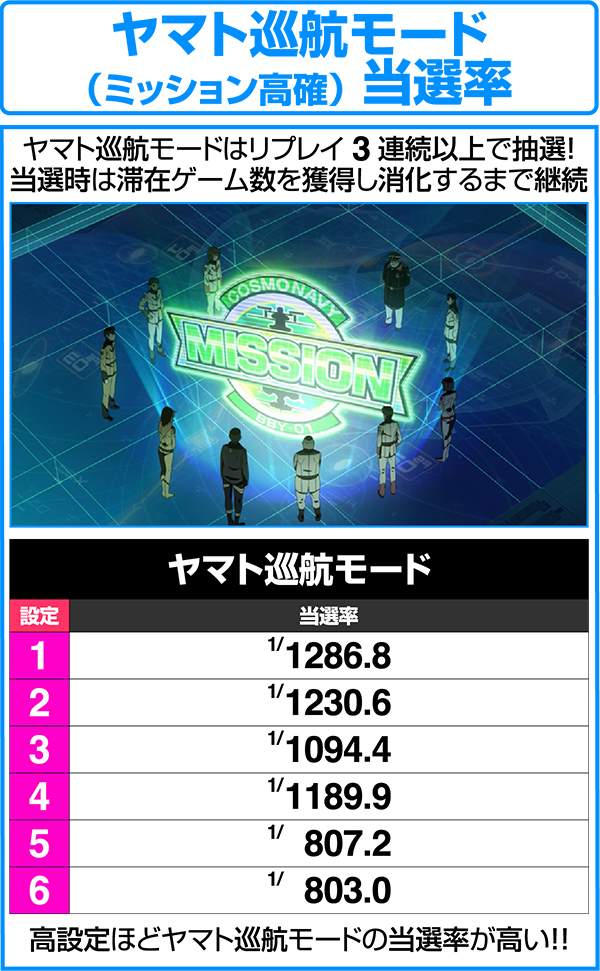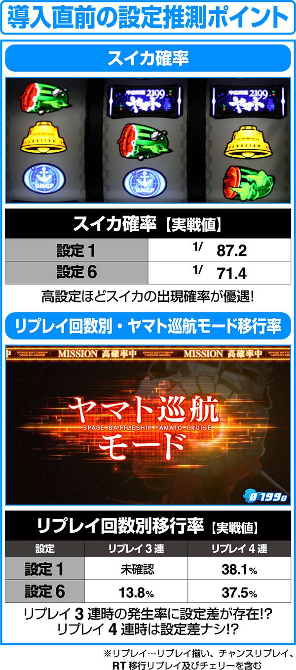 また、3連時でのヤマト巡航モードの当選率に設定差があり、高設定ほど優遇されている。