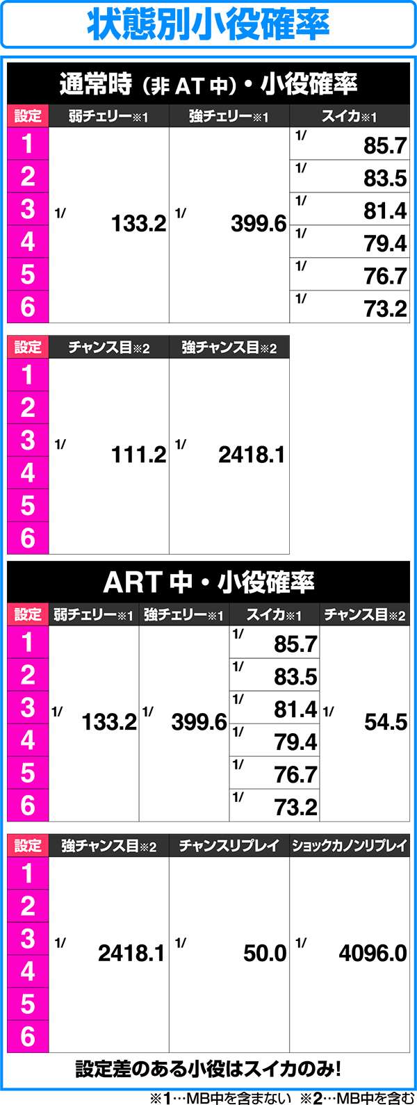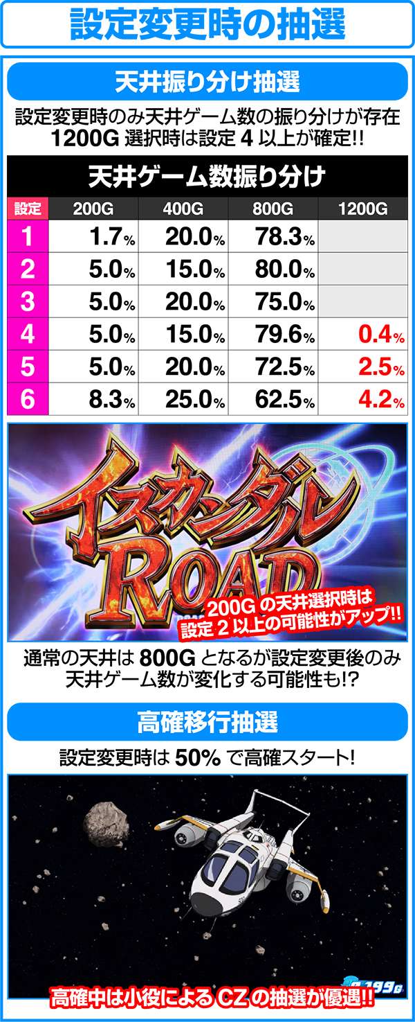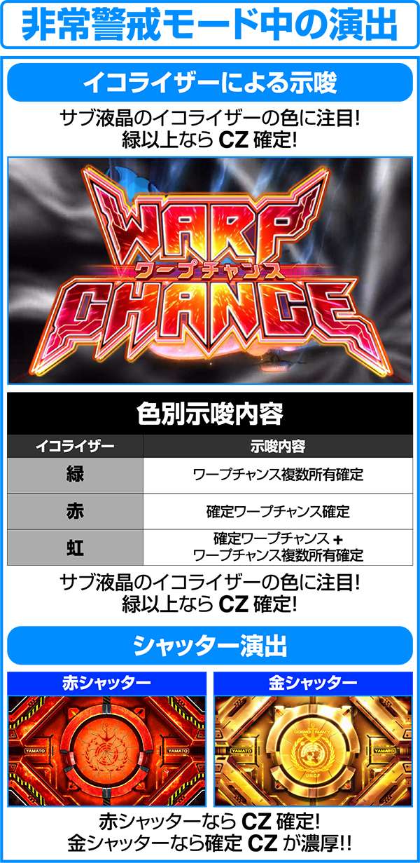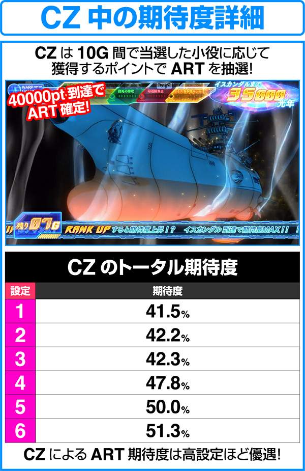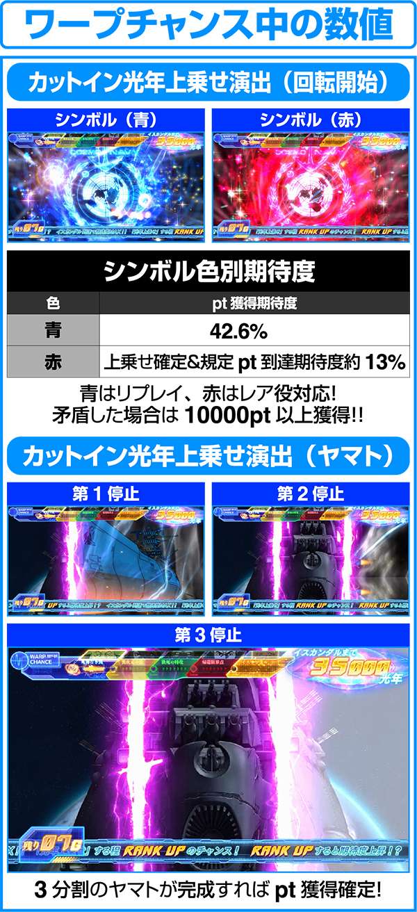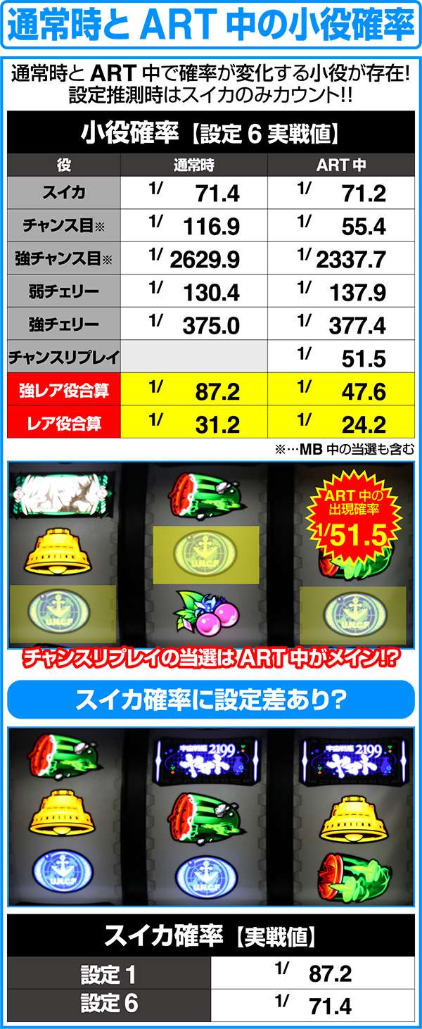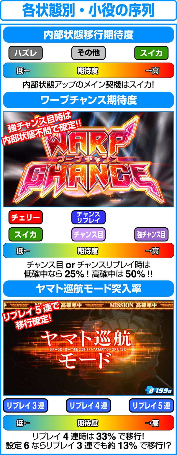 また、3連時でのヤマト巡航モードの当選率に設定差があり、高設定ほど優遇されている。