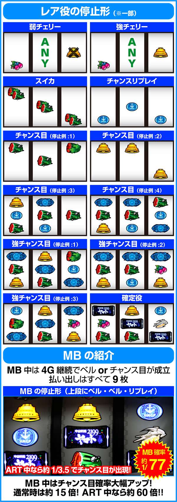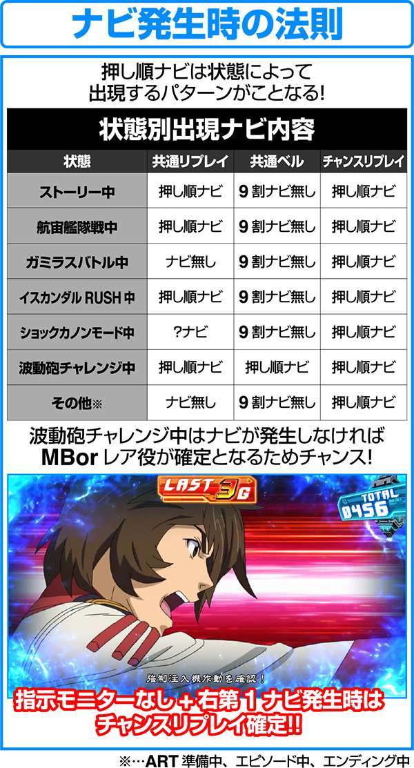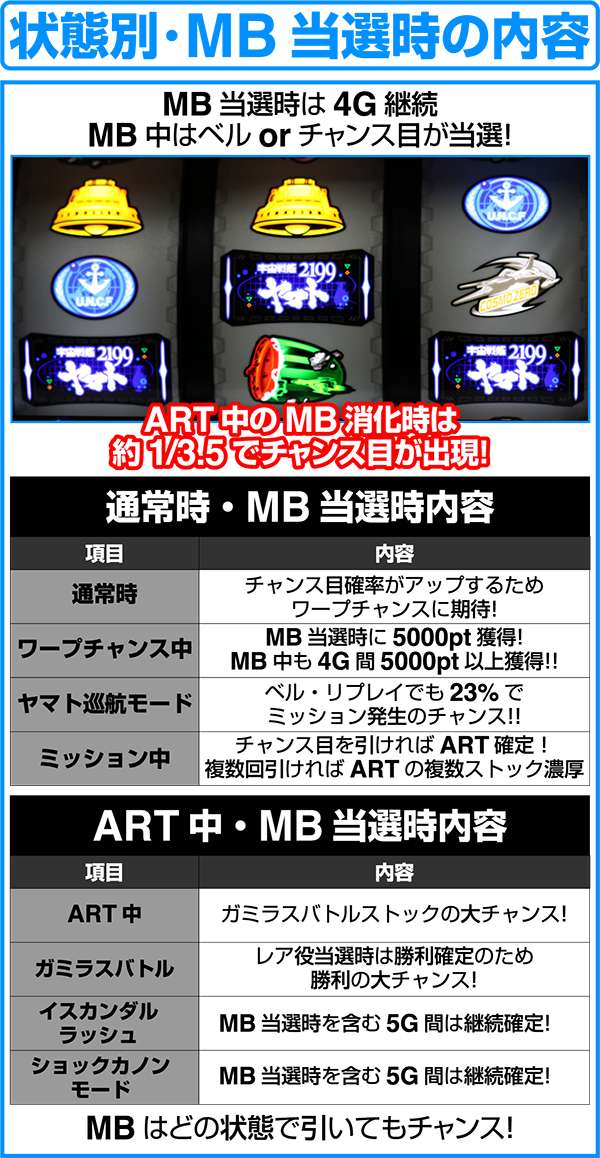 MB当選はどの状況にあっても展開を有利にしてくれるが、引いたタイミングもとても重要。通常時はCZ中に当選すればptを多く獲得できるチャンス、ART中ならMB中のチャンス目確率が約3.5分の1となるため、ガミラスバトル当選のチャンスといえる。