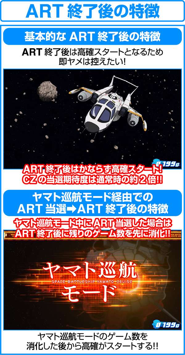 また、ヤマト巡航モード経由でのART終了後は、ART当選時のヤマト巡航モードの残りゲーム数をそのまま引き継ぐ。ゲーム数が残っていた場合は、消化してから高確がスタートするので、ART終了後はチャンスが多いといえる。