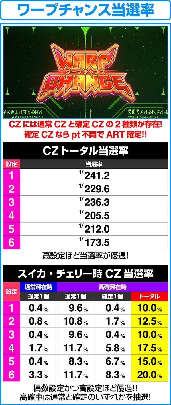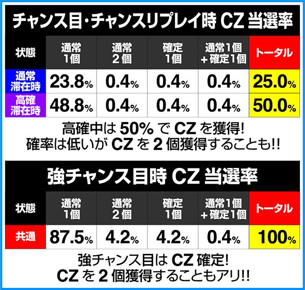 ART終了後は基本的に高確スタート確定となるため、即ヤメは控えたい。高確中ならCZの当選期待度が通常の2倍となっている。