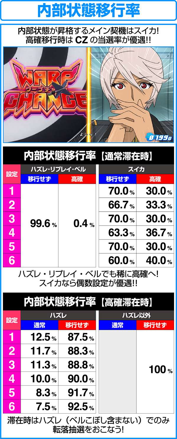 確定ワープチャンスの獲得には設定差が存在するため、イコライザーの虹やシャッター演出の金などが発生した場合は、確定CZが確定するため高設定の可能性がアップする。