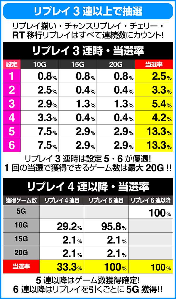 また、上乗せ特化ゾーンは、どちらもリプレイが終了契機となるため、MB当選を含む5G間は継続+ゲーム数上乗せのチャンスとなっている。