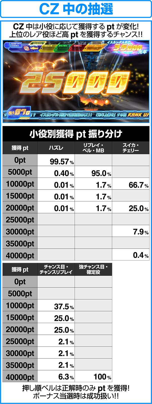 また、レア役当選時は高ptを獲得する可能性が高くなっており、ボーナスに当選した時はCZ成功扱いとなる。