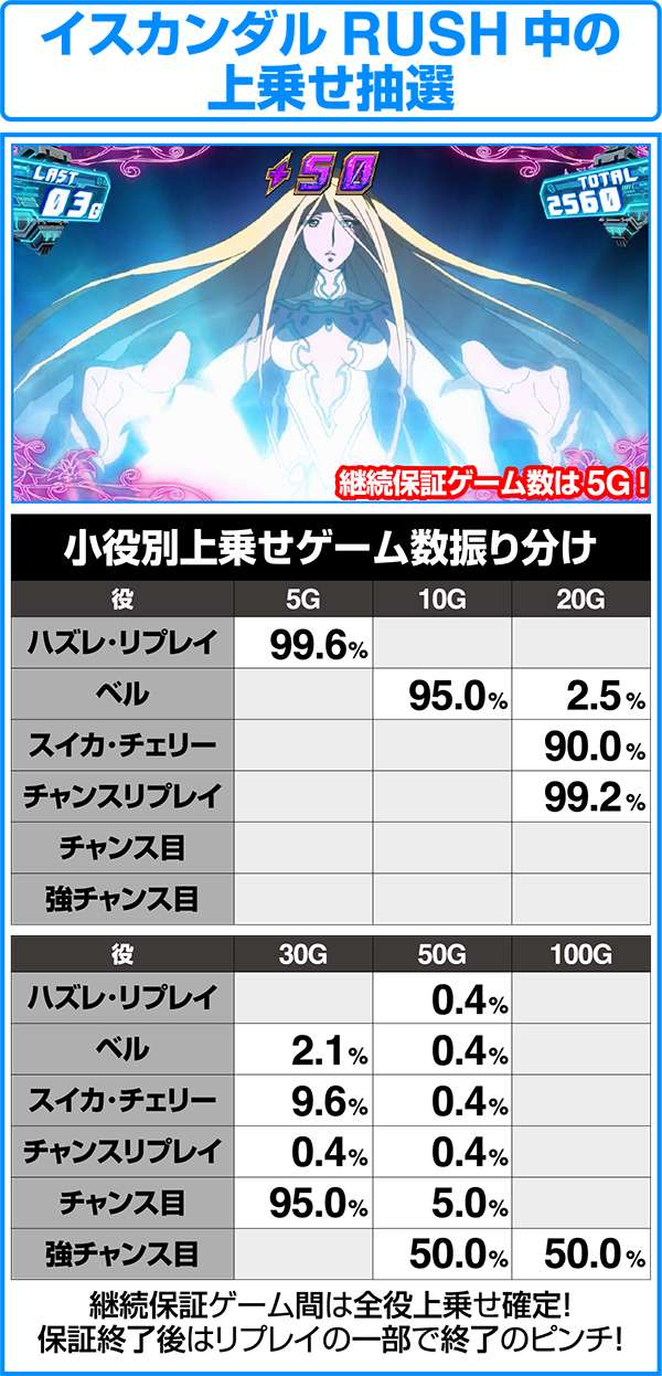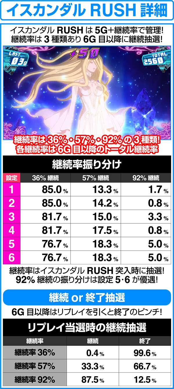 イスカンダルRUSHは5G+継続率となっており、6G以降はリプレイ成立時のみ継続or終了抽選をおこなう。すなわち、6G目以降もリプレイ以外に当選すれば継続確定となる。