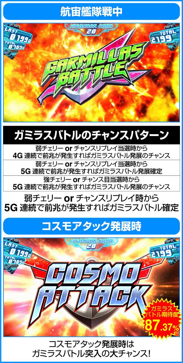 ゲーム数上乗せのメインとなるガミラスバトルはART中のレア役などから突入する。1回のレア役で複数個獲得することもあり、その場合はサブ液晶に「連戦準備」の文字が発生する。