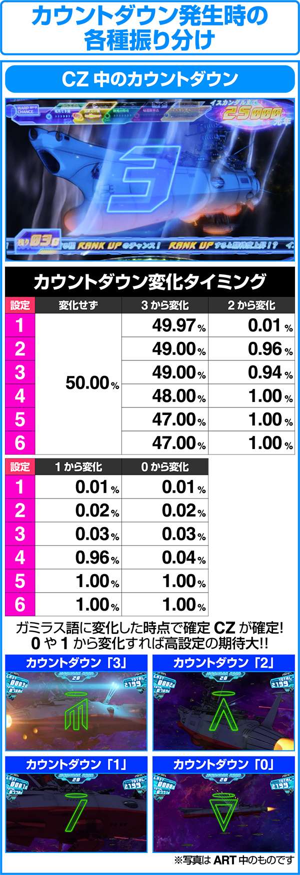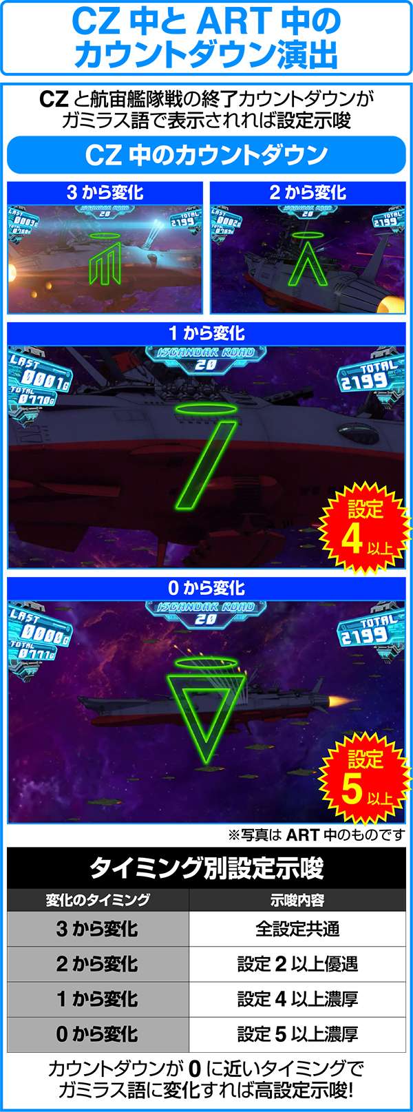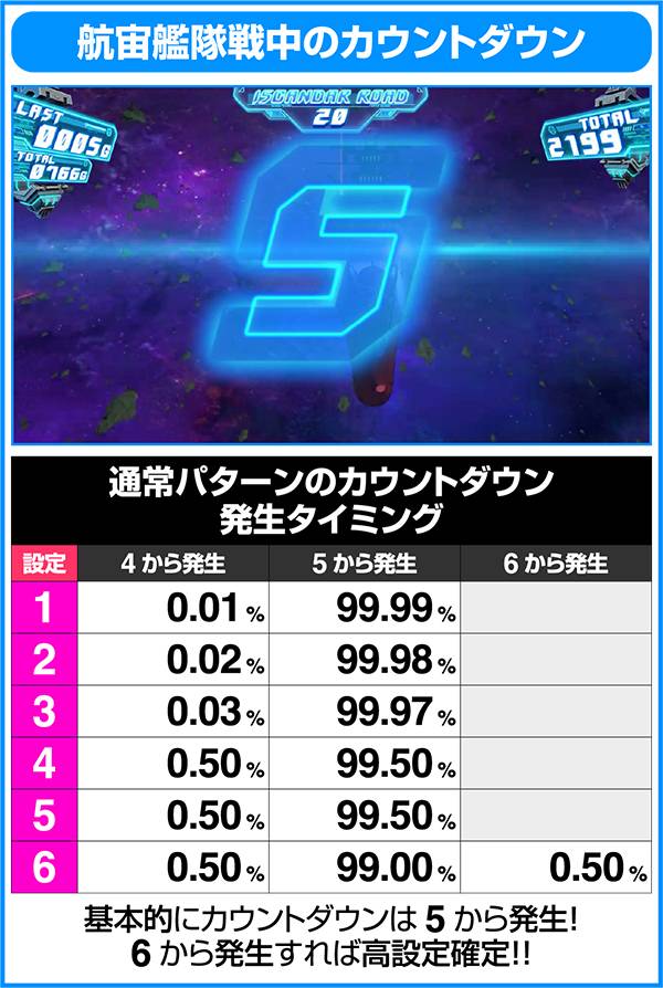 ワープチャンスの残りゲーム数カウントダウンとイスカンダルロードの航宙艦隊戦の残りゲーム数カウントダウンの2ヶ所でカウントダウンが発生。カウントダウンの種類には、ノーマルとガミラス語の2種類が存在し、ガミラス語なら発生タイミング次第で設定示唆となる。