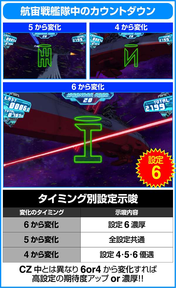 CZ中なら残り2G目から、航宙艦隊戦中なら6or4ゲーム目でガミラス語に変化すれば、高設定の可能性がアップする。