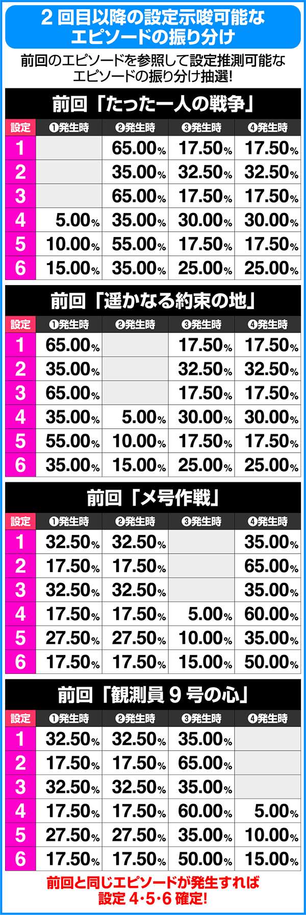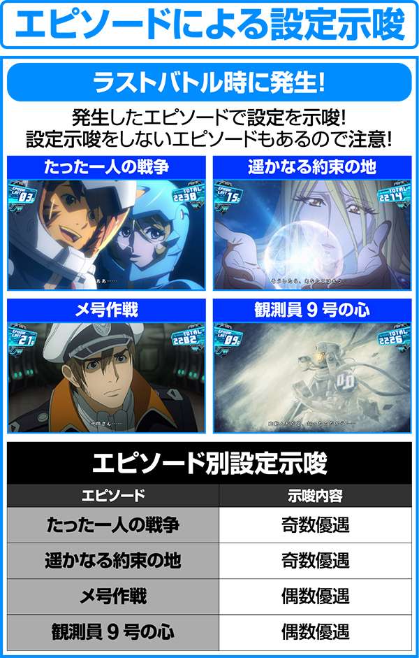 エピソードはラストバトルorラストバトル勝利時の一部で突入し、設定示唆となるエピソードも存在。上記の4種類だけが設定示唆となるだけに、その他のエピソードと混合しないように注意したい。