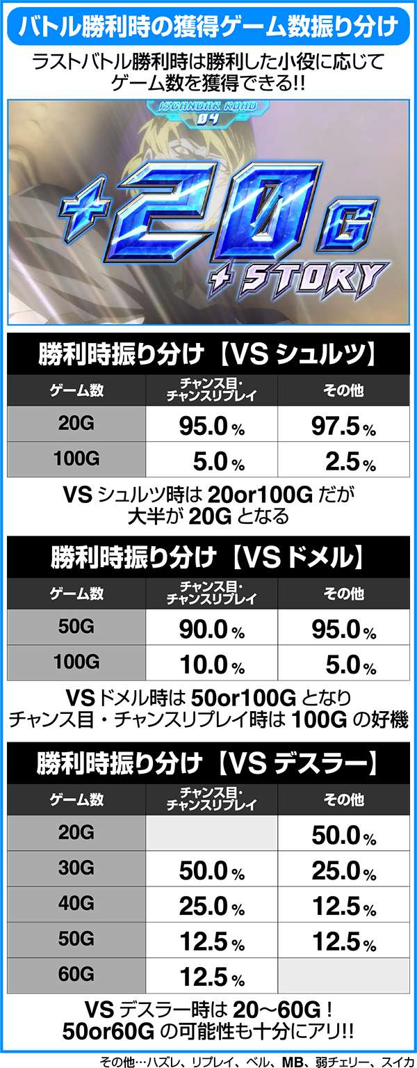 設定差が大きいポイントとして、VSシュルツの勝利期待度があるが、バトル中のチャンス目やチャンスリプレイで勝利書き換え抽選をおこなっているため、設定推測において、シュルツに勝利した場合でもバトル中にチャンス目かチャンスリプレイ、強チャンス目を引いている時は注意が必要となる。