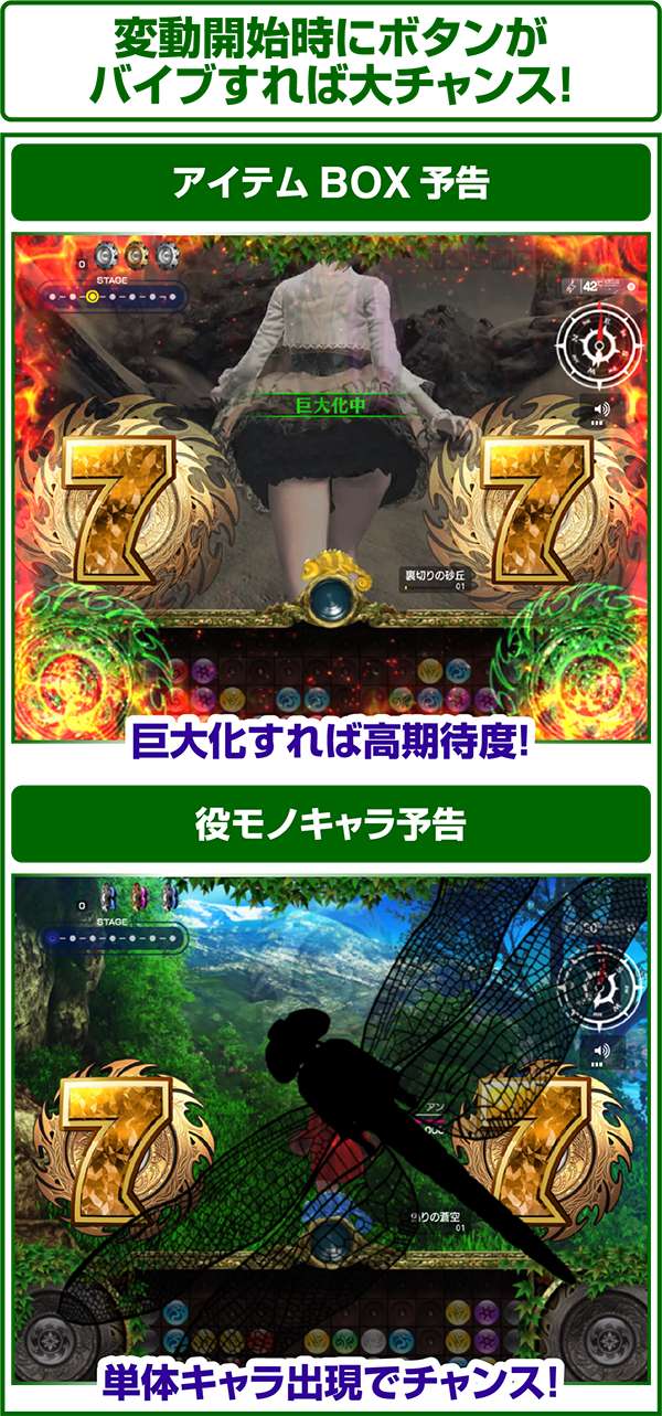 大当り確率約1/199のライトミドルかつ1種2種混合タイプ。 右打ち中は特有のスピーディな展開に加え、特図2経由の50%が約1800個獲得できる15Rと瞬発力に秀でている。 液晶演出では保留を使ったパズルゲームと巨大液晶で繰り広げられる大迫力のモンスターバトルといった新感覚のゲーム性が魅力。幻想的な世界で繰り広げられる壮大なストーリーも必見だ! |