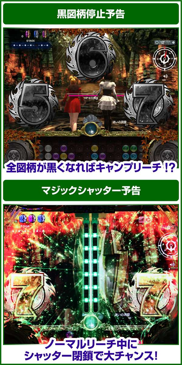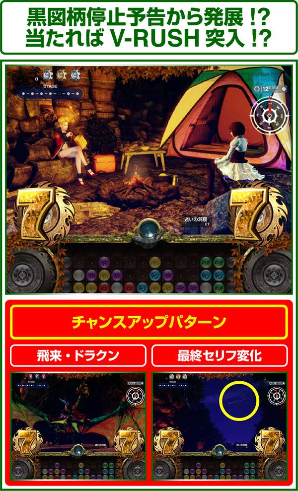 黒図柄停止予告から発展。発展時のリーチ図柄が7となるため、当たればV-RUSH突入!?