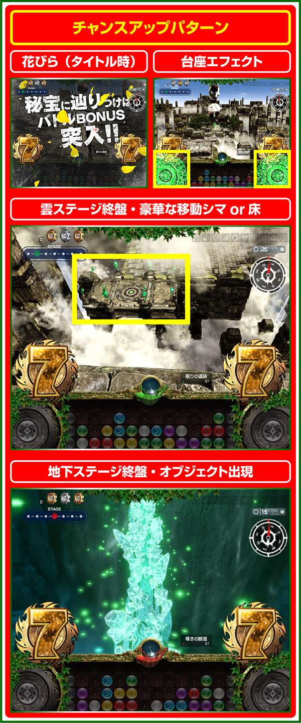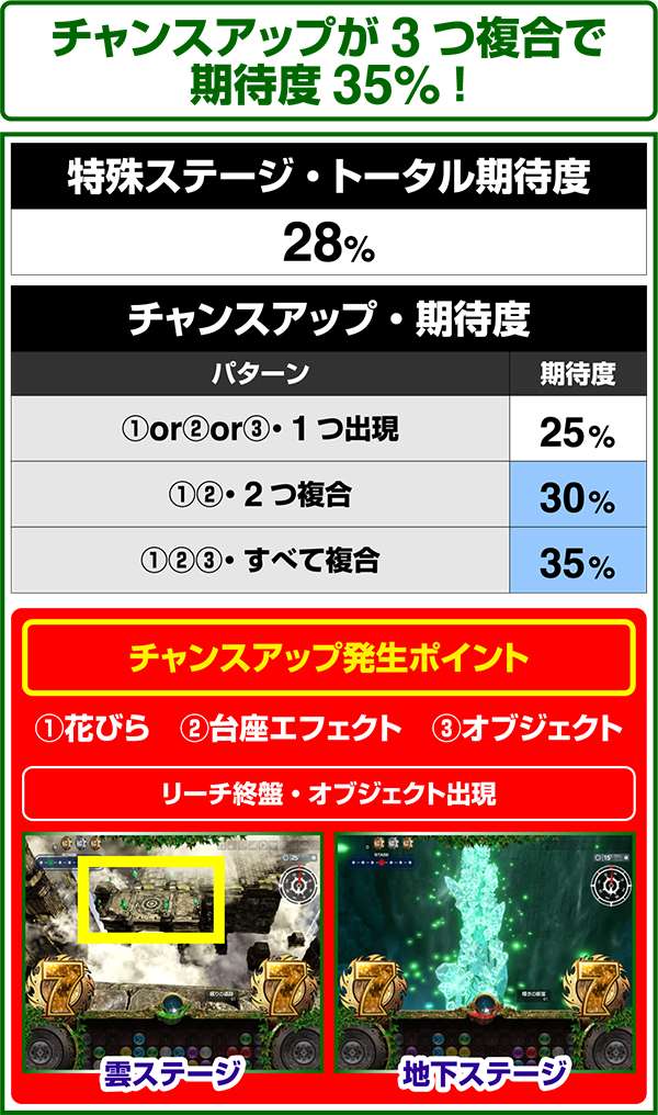 特殊ステージリーチと同様にチャンスアップの複合が大当りのカギを握る。