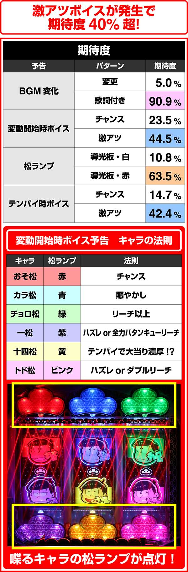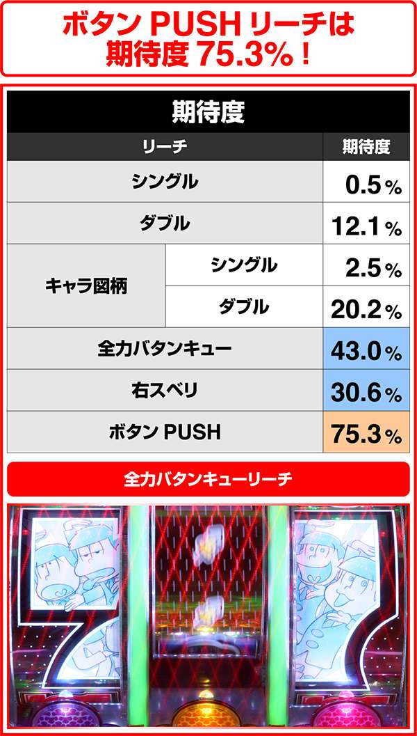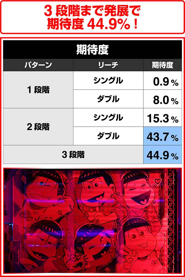初心者でも楽しみやすいスペックとゲーム性がわかりやすいドラムを採用。 ライトミドルの確変はSTタイプで突入率100%、50回転とオーソドックスな仕様。 演出はドラム機ならではの動きにおそ松さんの世界観が融合していて、今までのドラム機とは少し違ったものに進化。 ドラム好きとおそ松さんファンにはたまらない1台に仕上がっている。 |