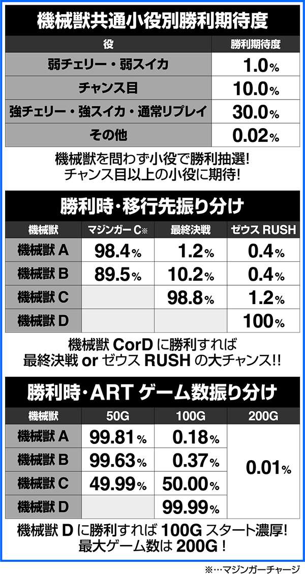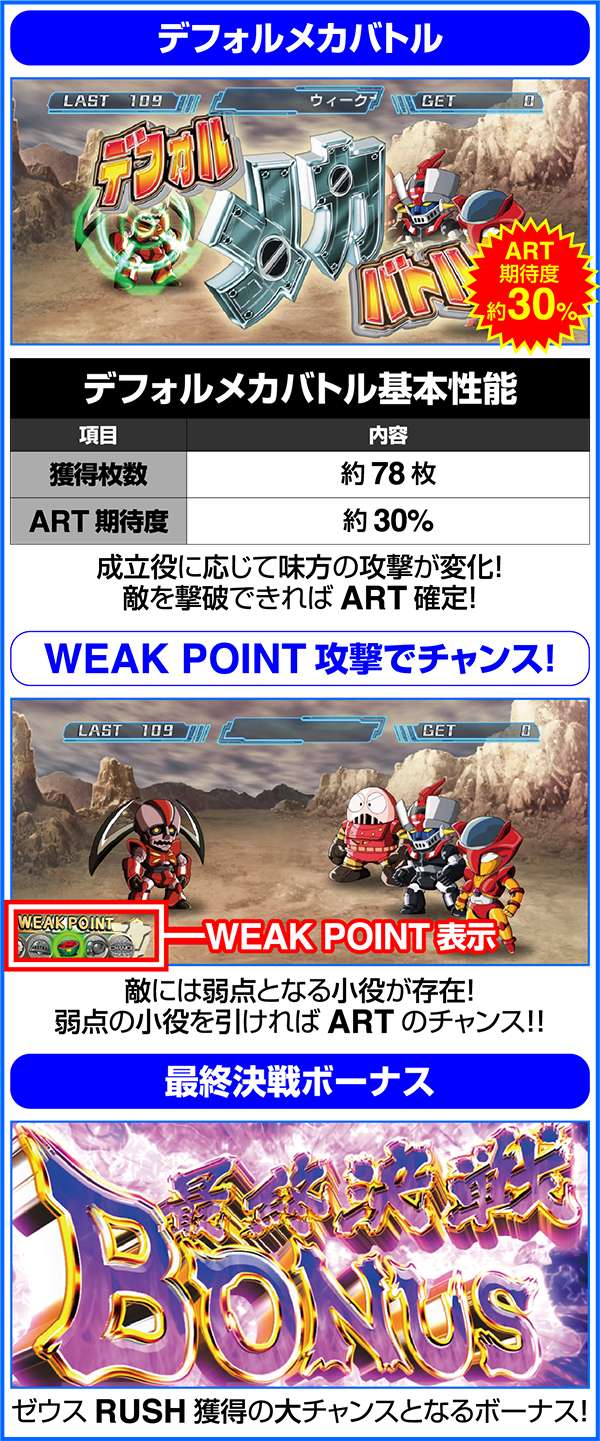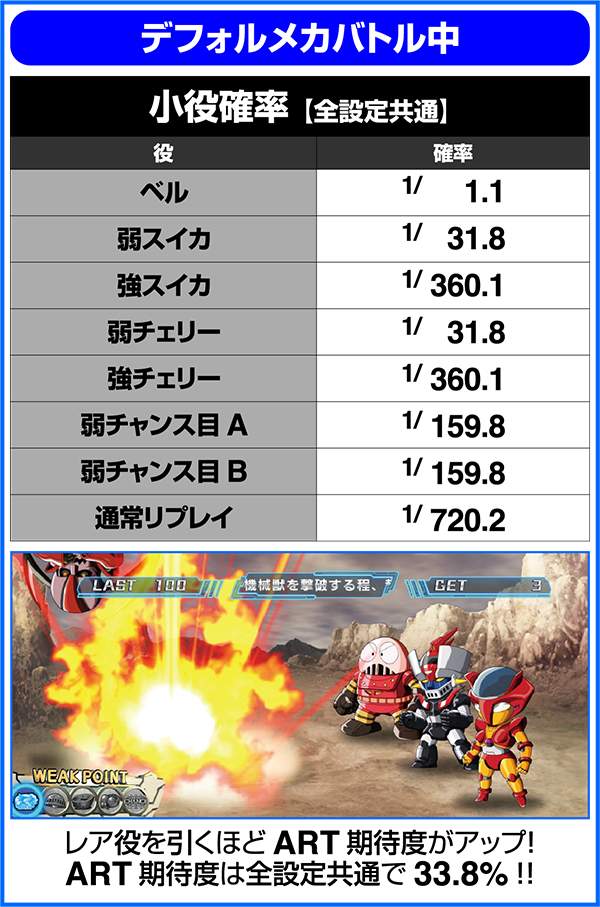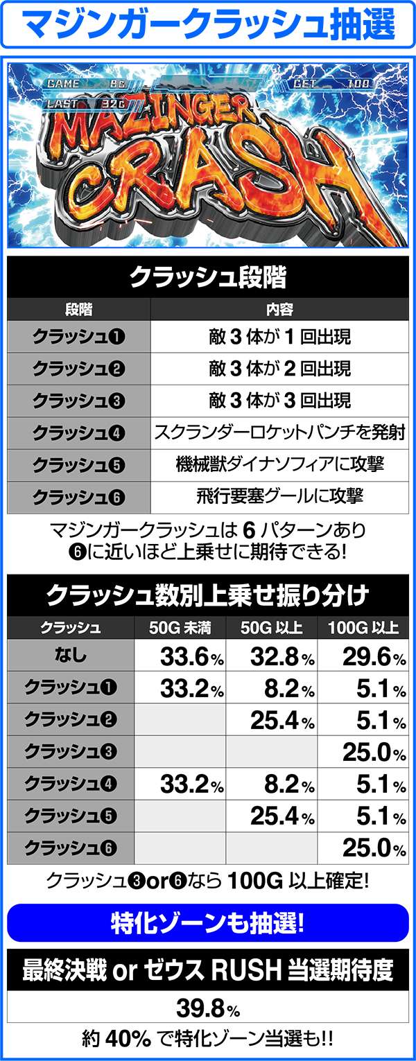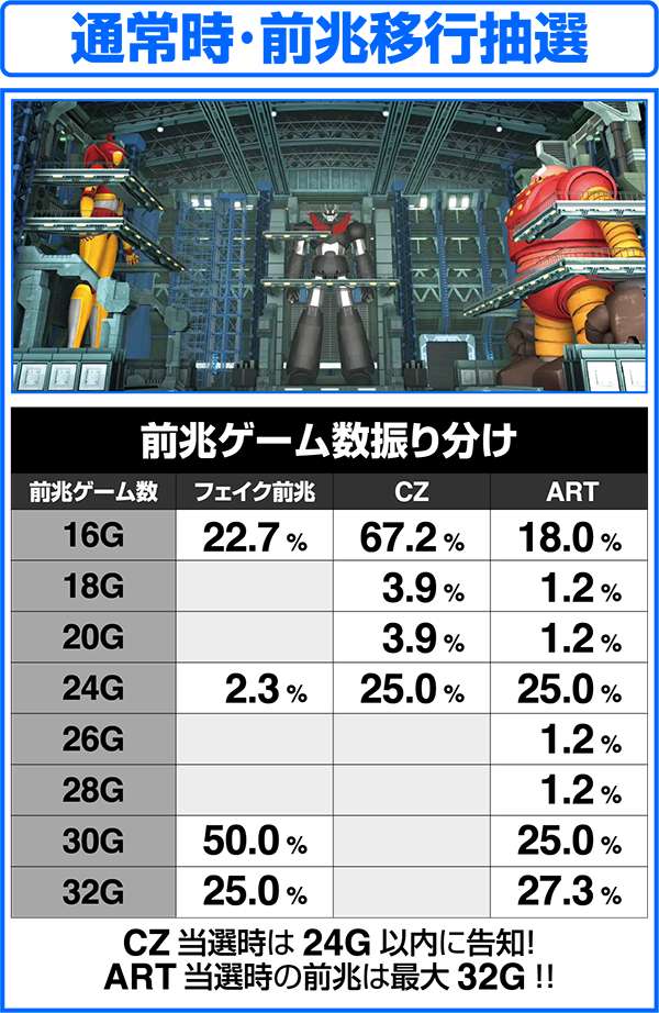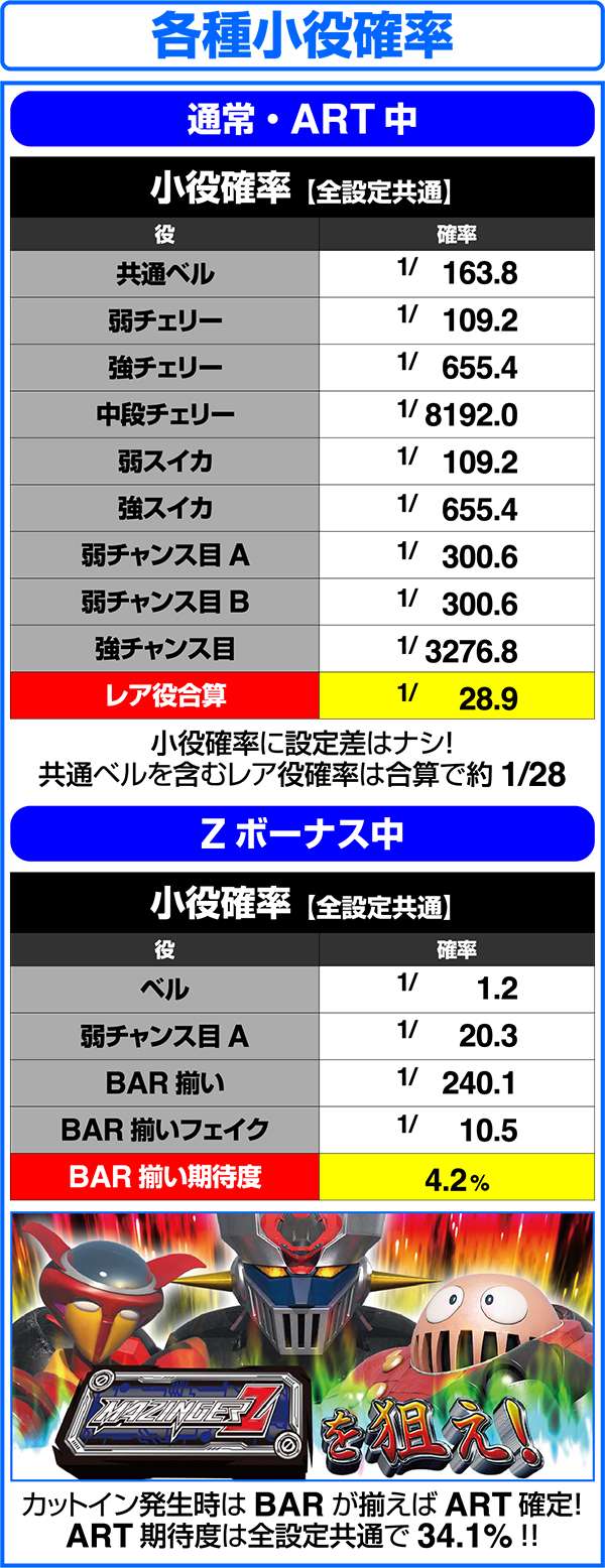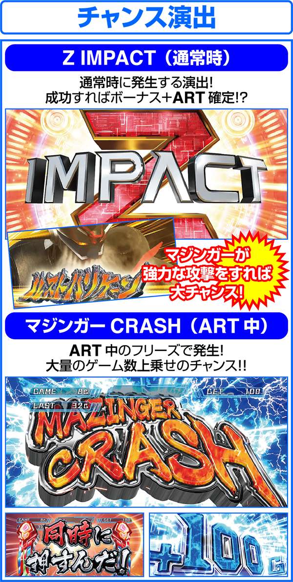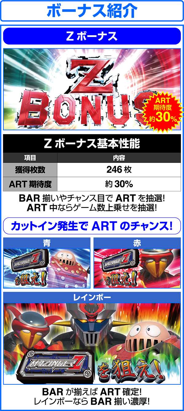 人気ロボットアニメ「マジンガーZ」がボーナス+ART機となって登場。 ART「マジンガーRUSH」は純増約1.6枚。継続率管理で最大継続率は80%となる。 基本となるボーナスはZボーナス(246枚)とデフォルメカバトル(約78枚)の2つ。いずれもART期待度は約40%。ART中の特化ゾーンは、ゲーム数、ARTストック、特化ゾーンゲーム数の上乗せとトリプル抽選だけにロング継続に期待できる。 |
