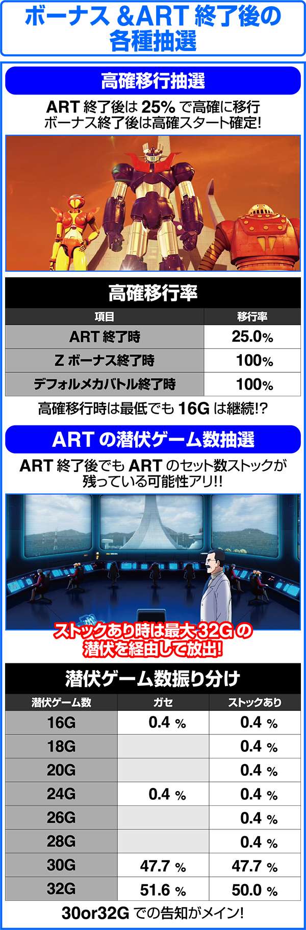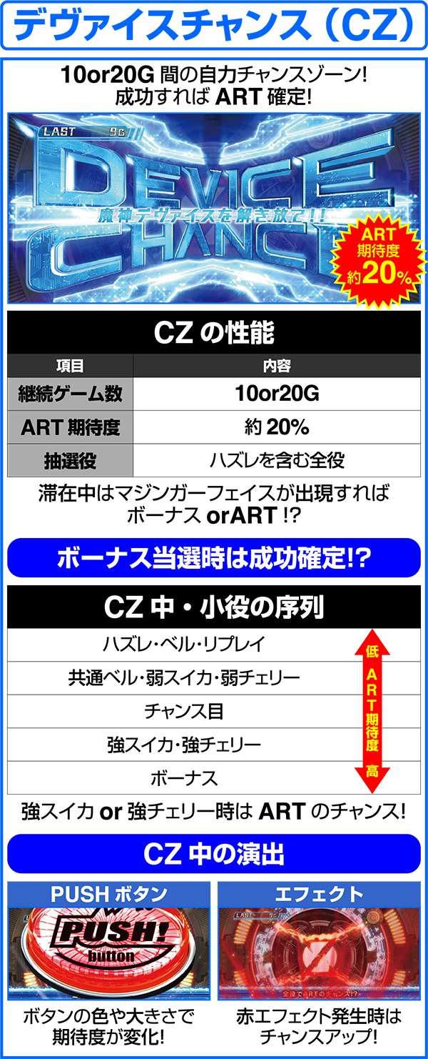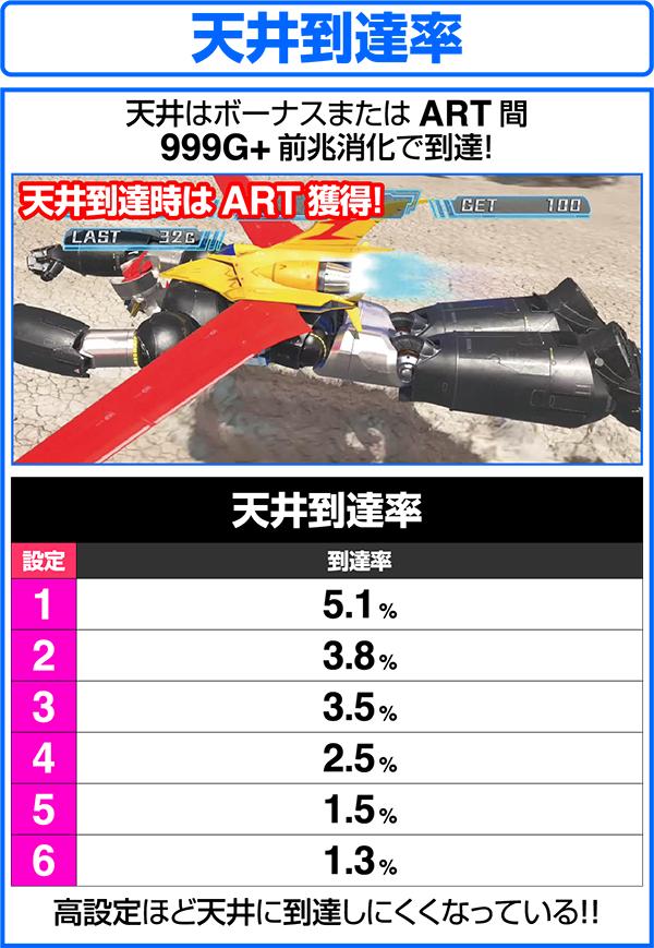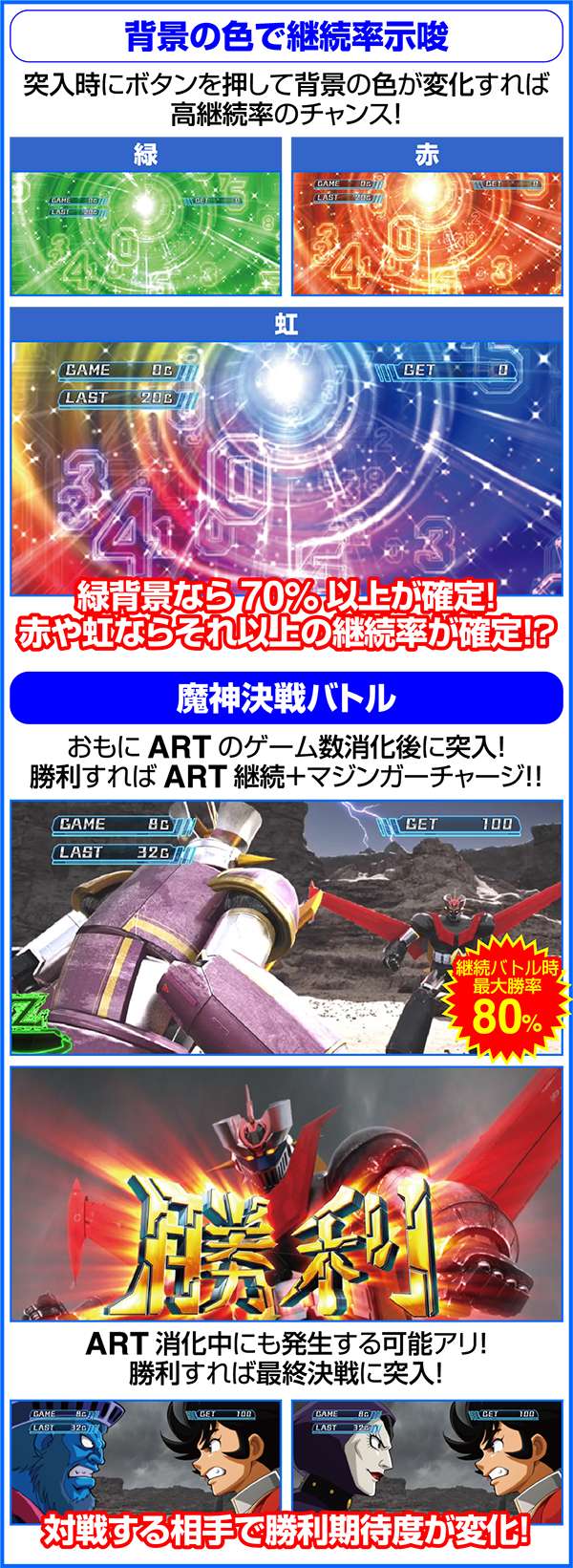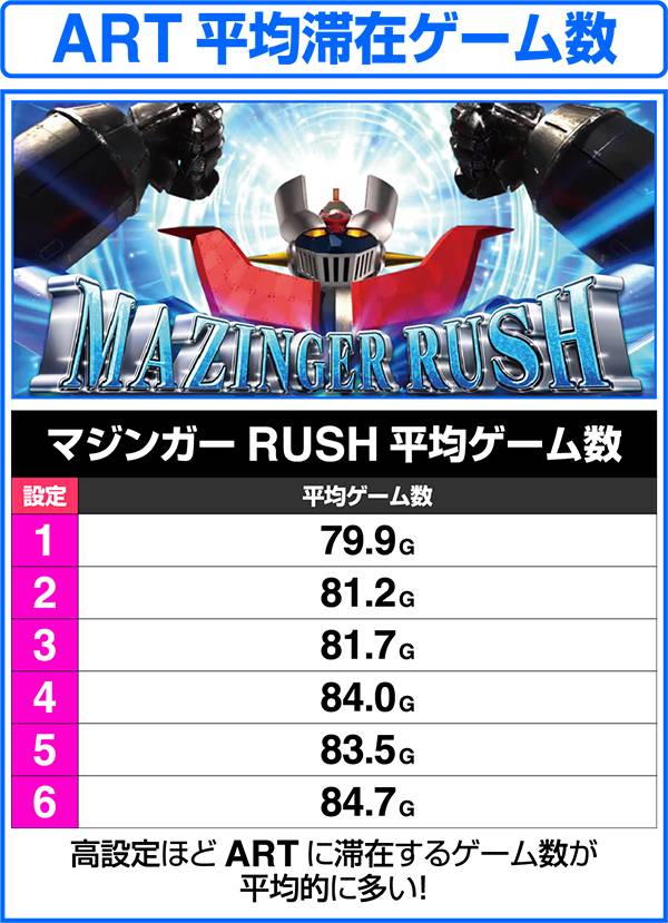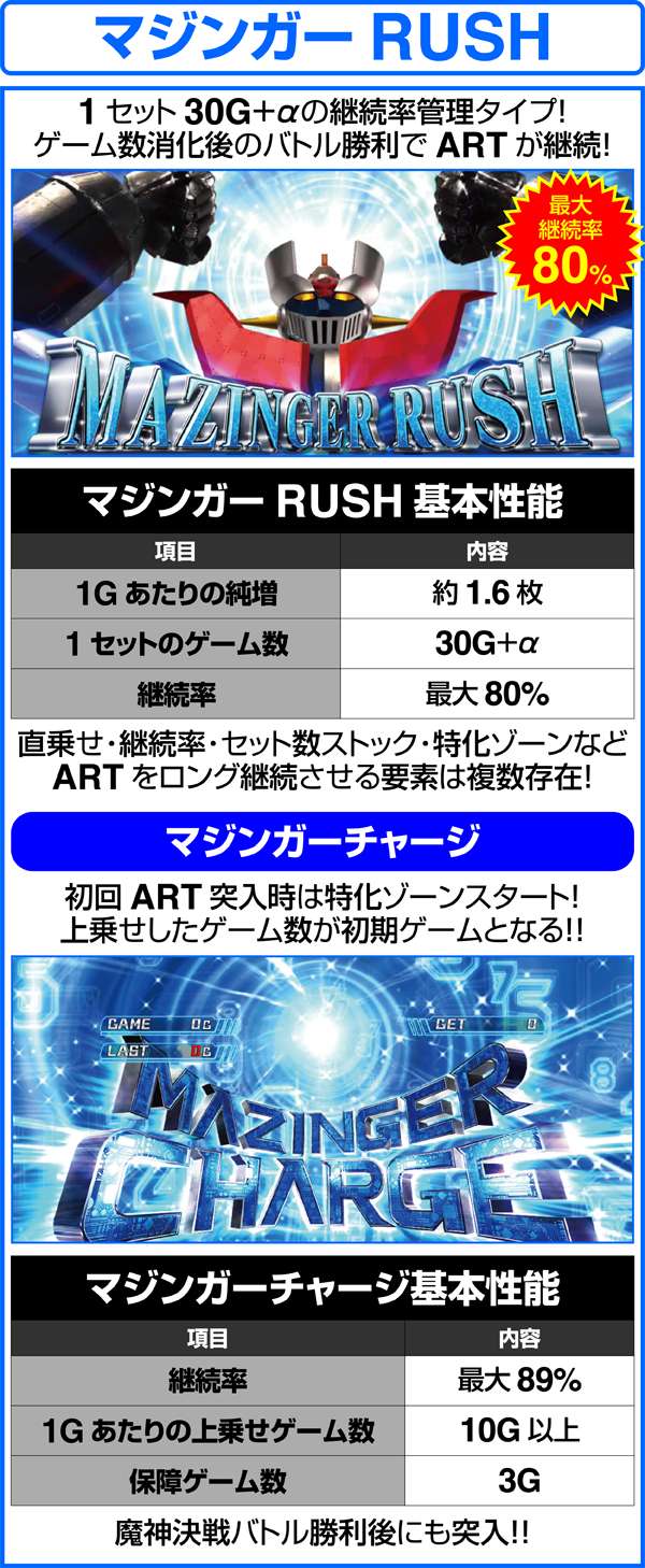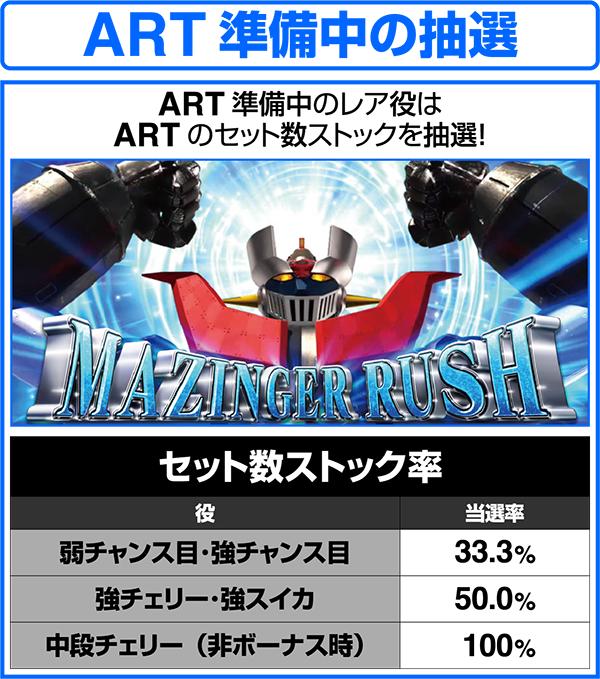 ARTの初回突入時はマジンガーチャージで初期ゲーム数を決定してからARTがスタート。ART消化中はレア役やボーナス、特化ゾーンなどでゲーム数やセット数ストックを獲得し、ARTのロング継続を目指す。ARTのゲーム数を消化した後は、魔神決戦バトルで継続or終了の抽選をおこなう。バトル勝利後は再び、マジンガーチャージを経由して、ARTが継続する。