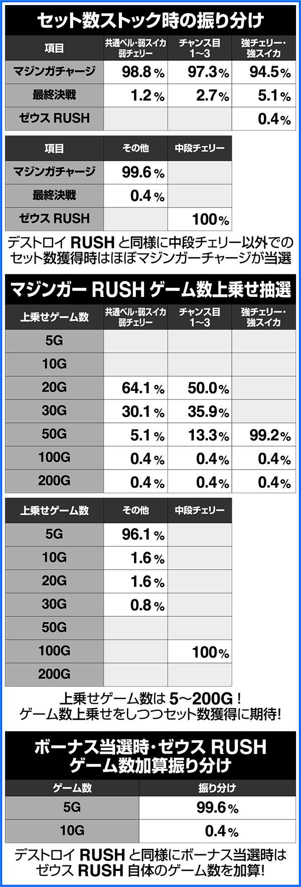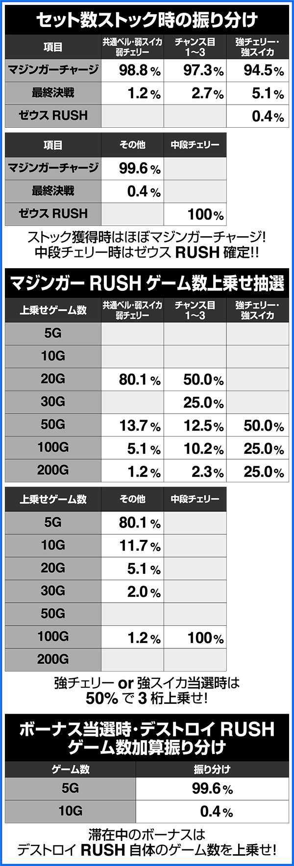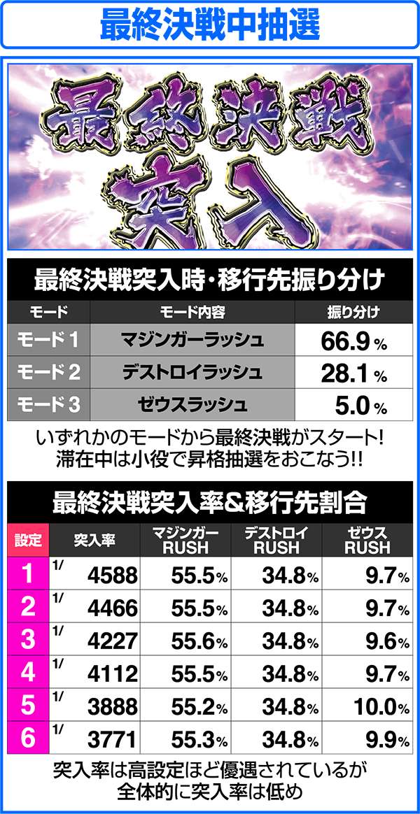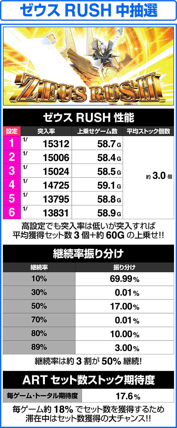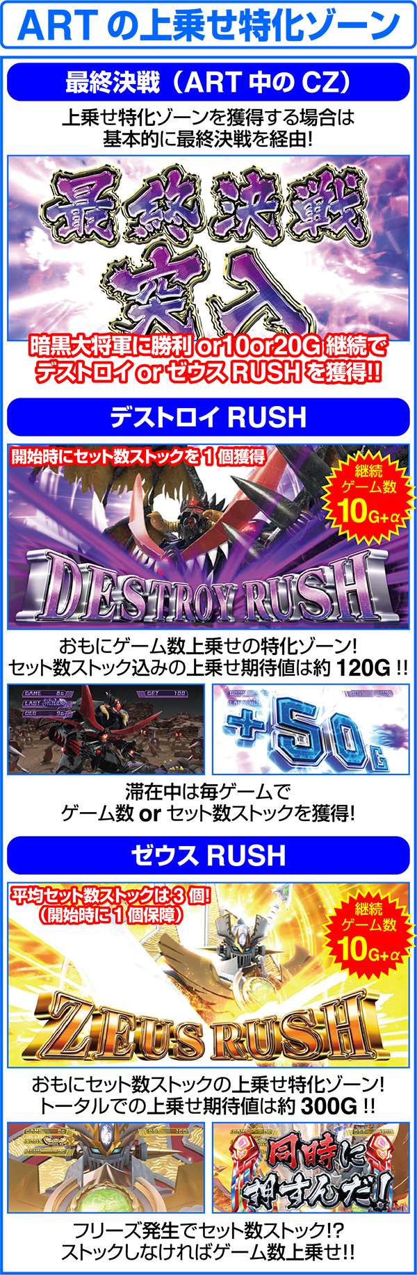 上乗せ特化ゾーンのデストロイRUSHとゼウスRUSHはゲーム数上乗せとセット数上乗せ、特化ゾーン自体のゲーム数上乗せのトリプル抽選をおこなっている。各特化ゾーンは、おもに最終決戦を経由して突入する。