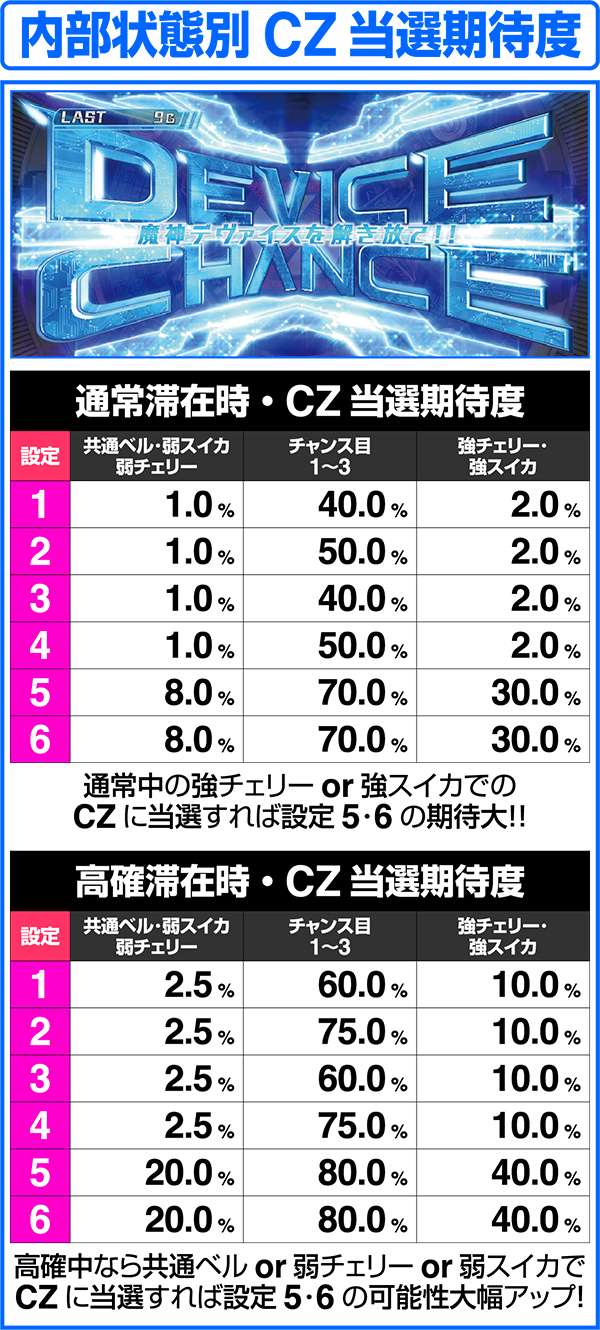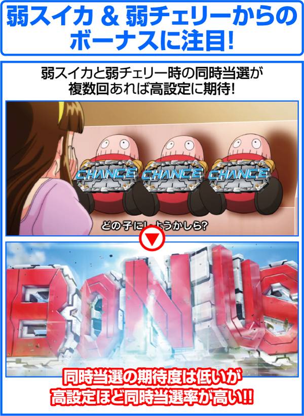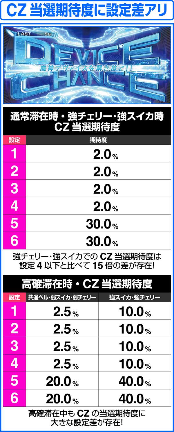 設定4以下と設定5以上では、CZの当選率に大きな設定差が存在。内部状態が通常ならば強チェリーと強スイカでのCZ当選期待度は15倍の差。また、高確時においては共通ベルと弱チェリー、弱スイカによる当選期待度の差も大きい。