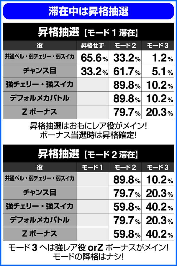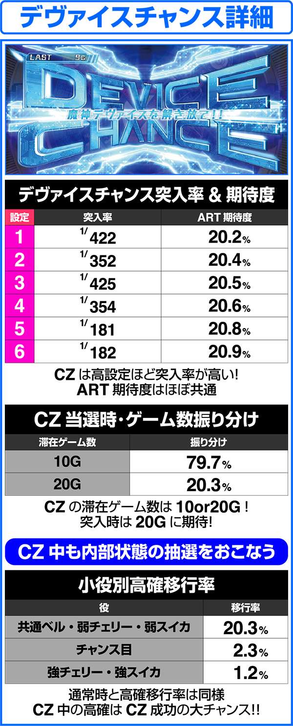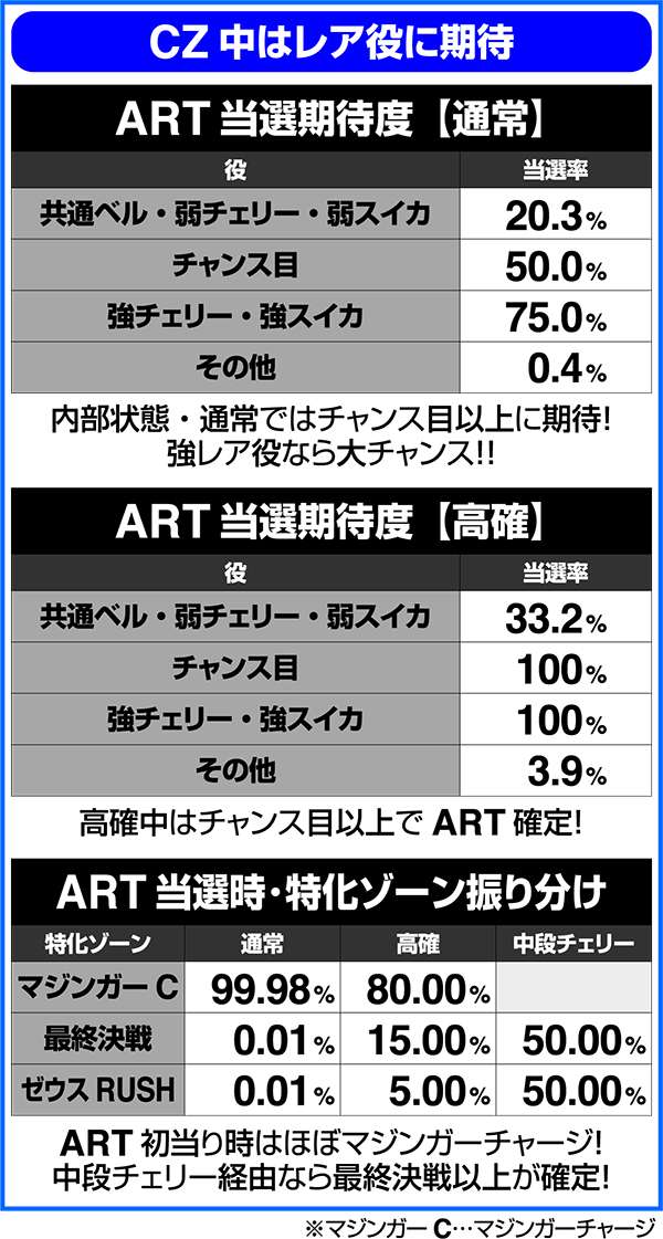 CZ中も高確移行の抽選をおこなっているため、通常滞在時に突入したCZでも、消化中に高確への移行に期待が持てる。高確中のCZは小役での当選率がアップしているため、ART当選の期待度も高まる。