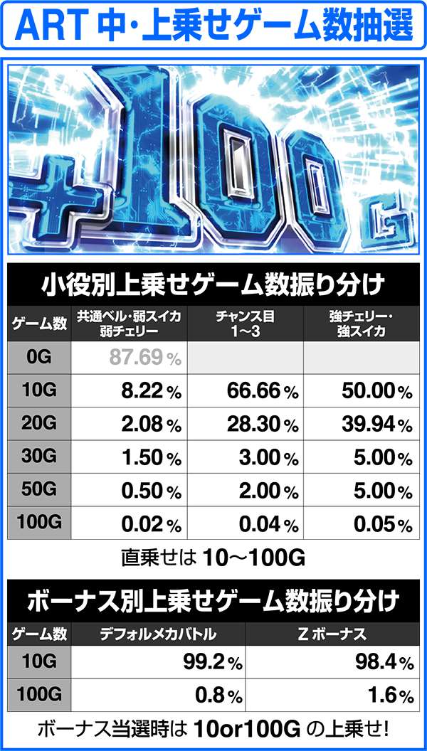 また、小役での上乗せ特化ゾーン当選時は、特化ゾーンの滞在ゲーム数が10G確定となっている。