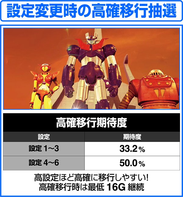 高確移行抽選(設定1〜3…33.2%、設定4〜6…50.0%)。
