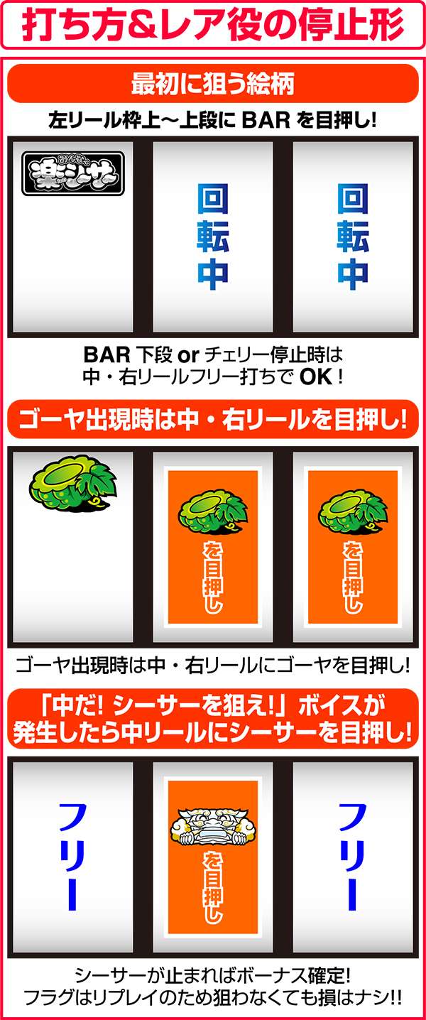 左リールにBAR絵柄を狙えば、ほぼすべての小役をフォローできる。左リールにゴーヤが停止した時だけ、中・右リールにゴーヤを目押しする必要がある。1枚役は左リールにBARを押すと獲得できないが、出現時はボーナス確定となる。