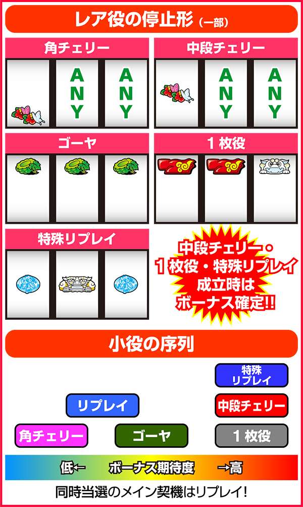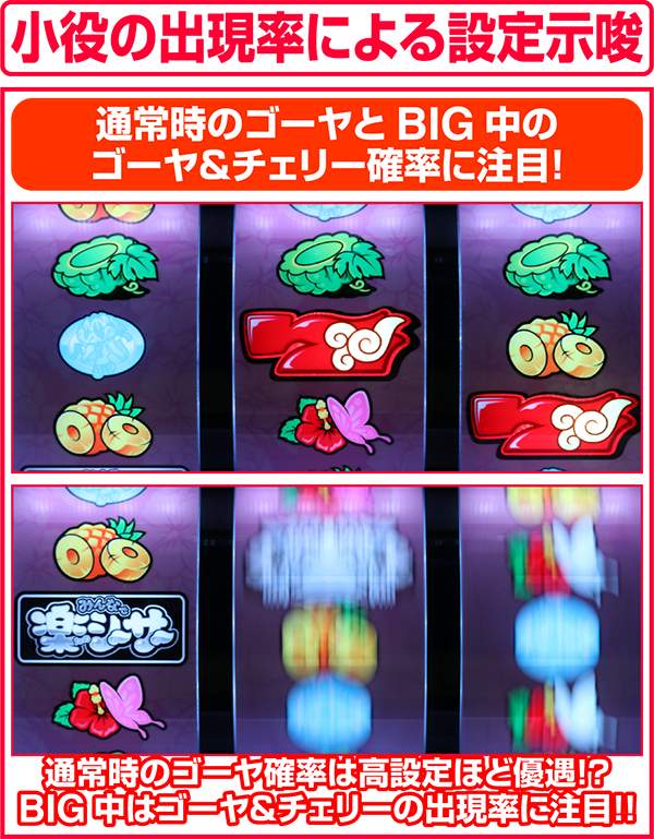 また、BIG中のゴーヤとチェリーの出現確率には設定差が存在している。
