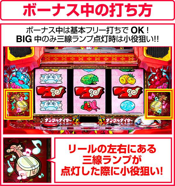 ボーナス中は基本的にフリー打ちで消化すればOK。BIG中はレバーON時に三線ランプが点灯した時だけ、小役狙いの手順でゴーヤorチェリーを獲得しよう。