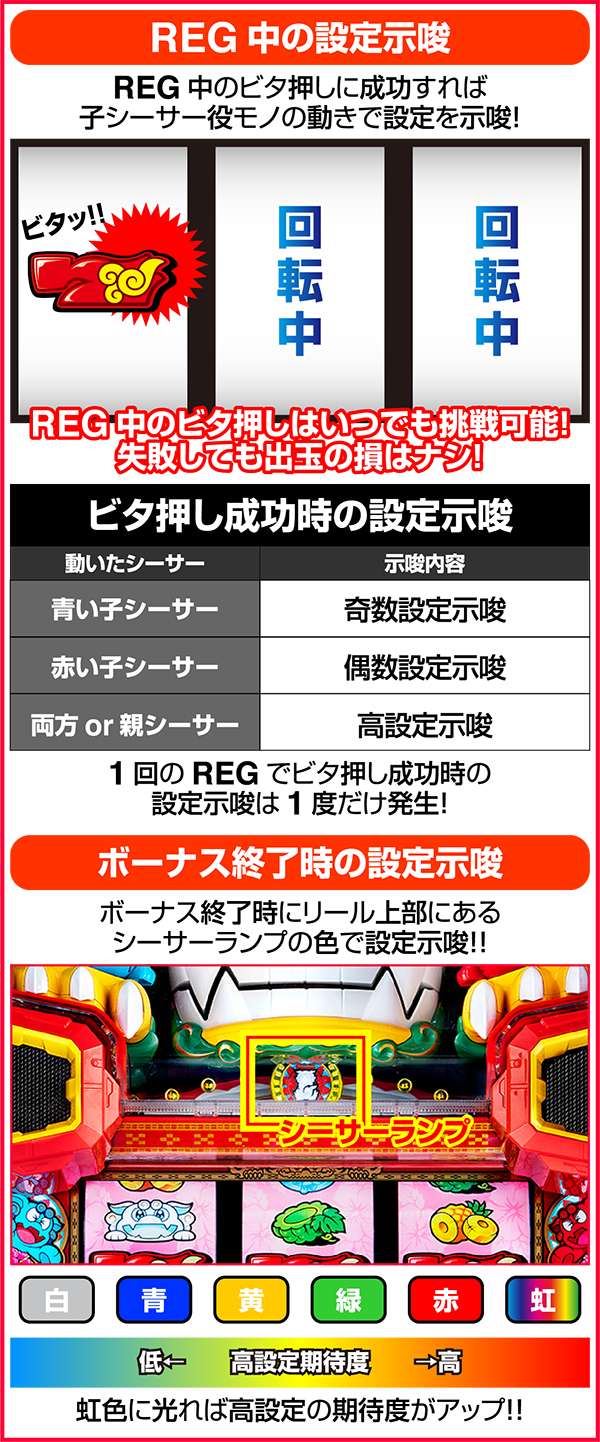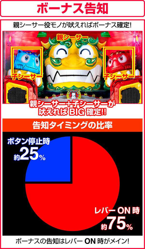 ボーナスの告知は大半がレバーON時となっており、告知時に子シーサーも吠えればBIGが確定する。