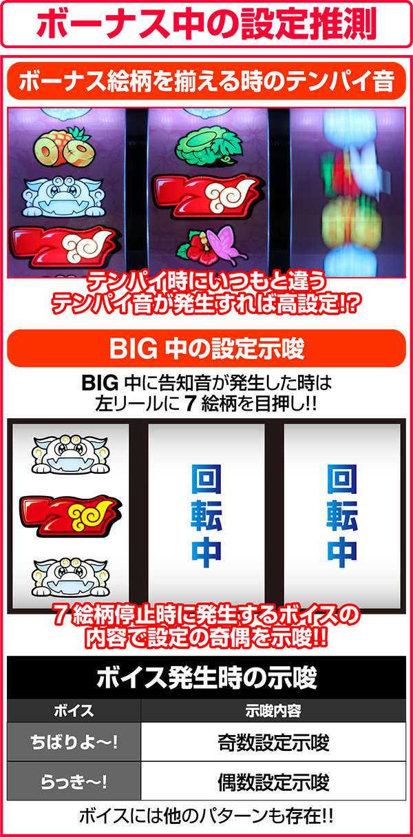 ボーナス関連の設定推測ポイントは複数存在。BIG中は告知音時にのみボイスを発生させるチャンスがあり、REG中は毎ゲーム挑戦が可能となる。BIG中は成功するたびにボイスが発生、REG中は1回のみ有効となっている。