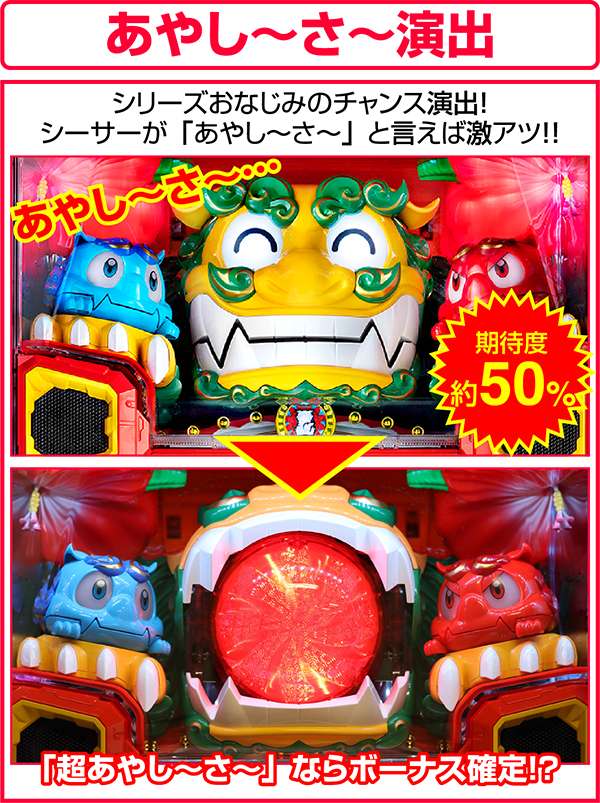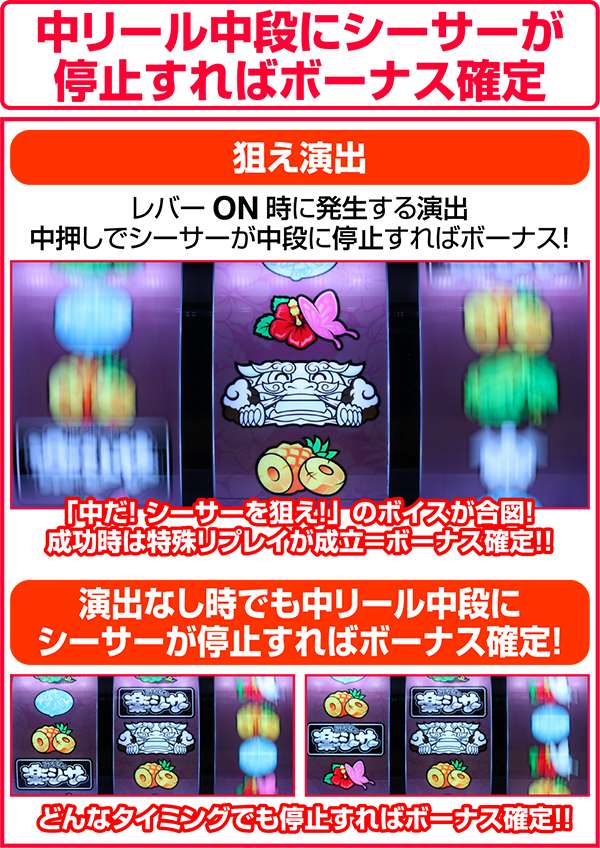 レバーON時に発生する演出で、発生時は中押しでシーサー絵柄が停止すればボーナス確定。失敗とみせかけた復活パターンも存在している。