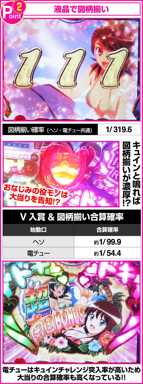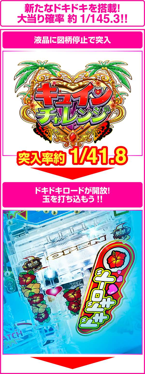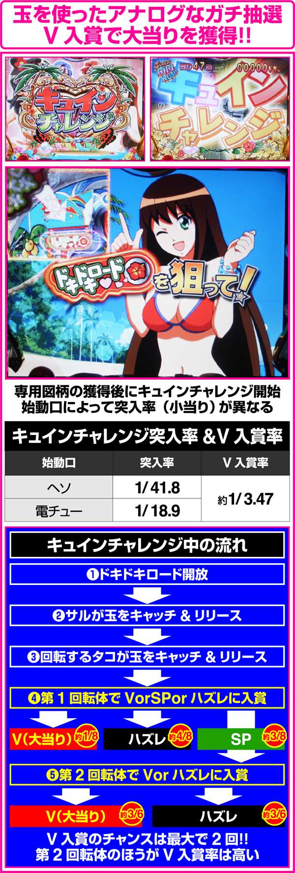 キュインチャレンジからの大当りがメインとなり、必ず電サポ50回転(SUPER南国RUSH)が付く。