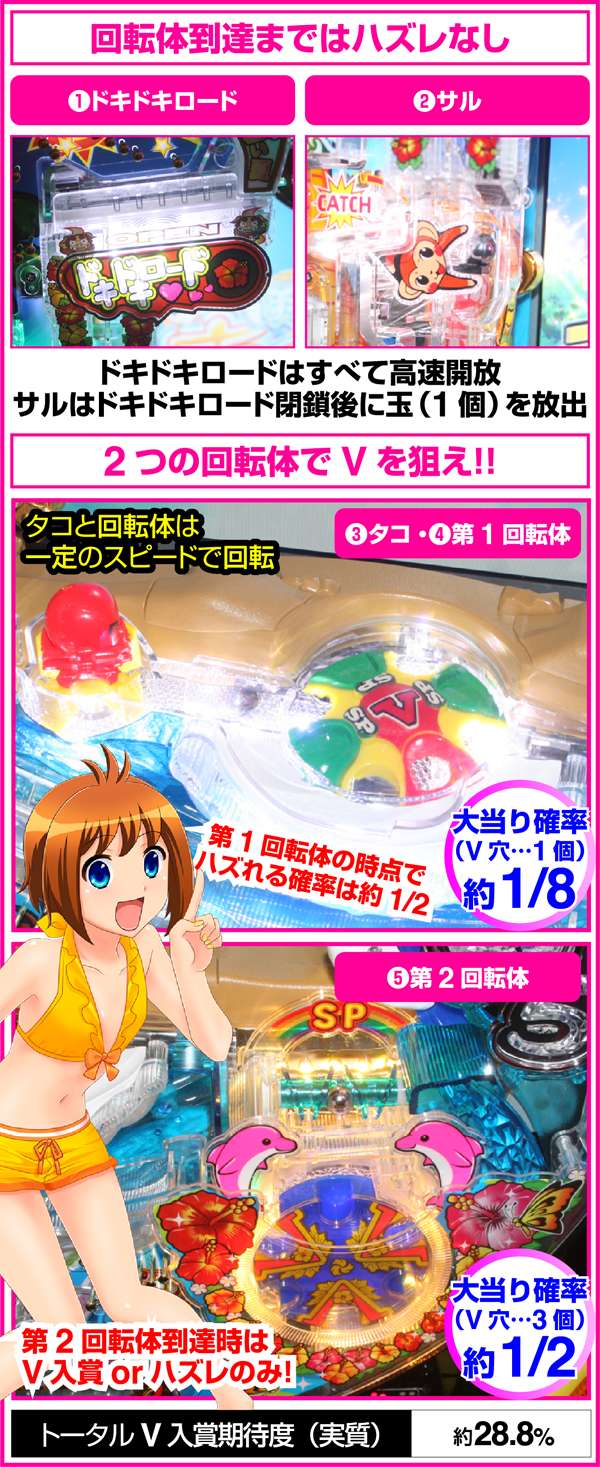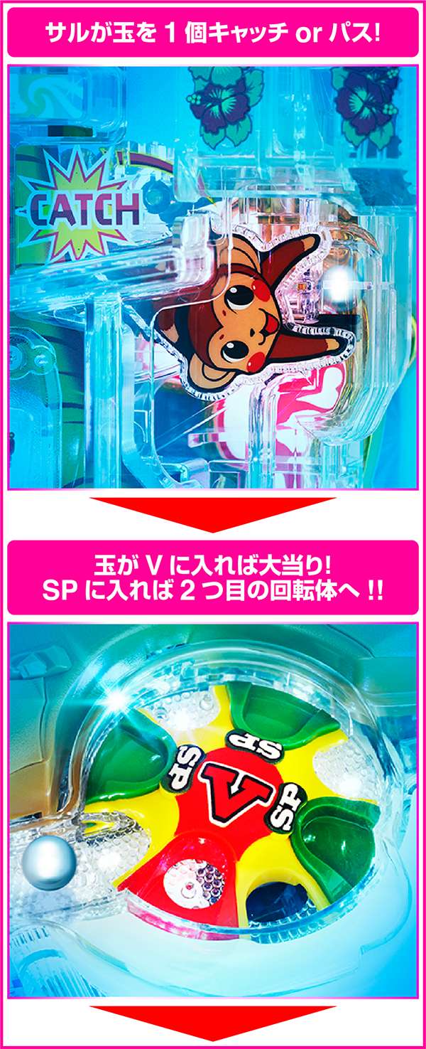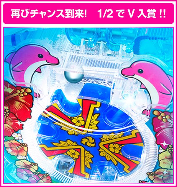約1/41.8でが訪れ、回転体のVに玉が入れば大当り。回転体は2つあり、1つ目でハズレてもSPに入れば再びチャンスがもらえる。