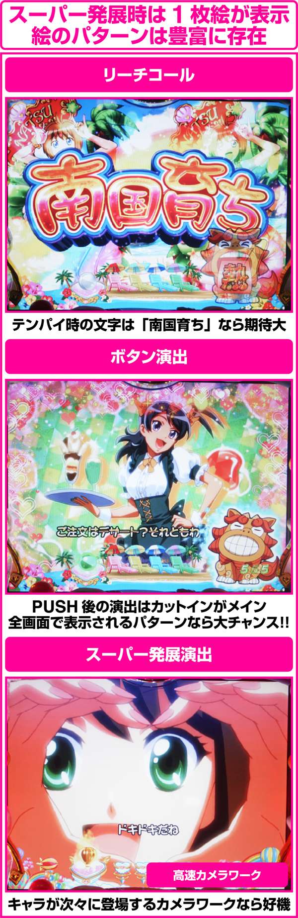 スーパー発展時は、高速カメラワークのパターンなら図柄揃い大当りに対応するリーチ発展の期待大。