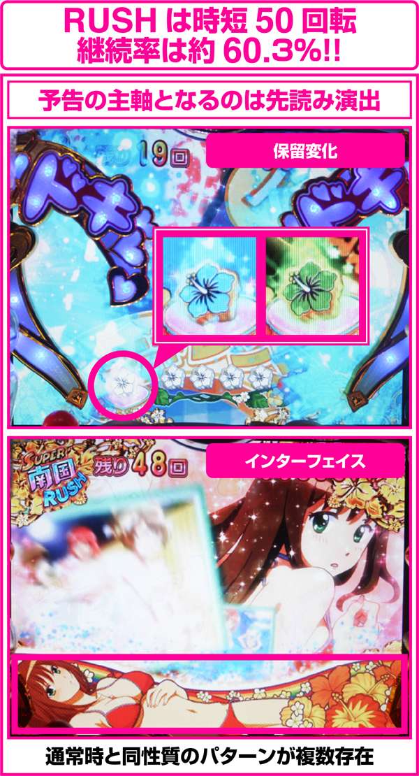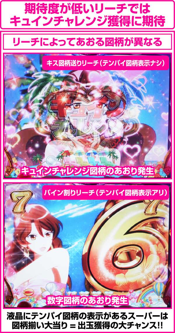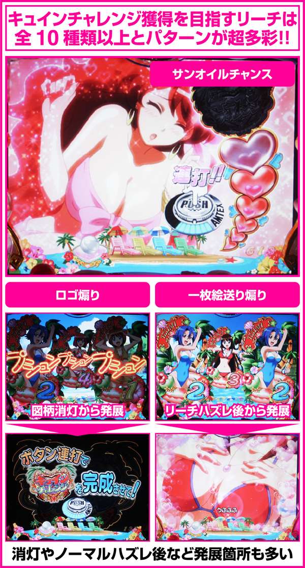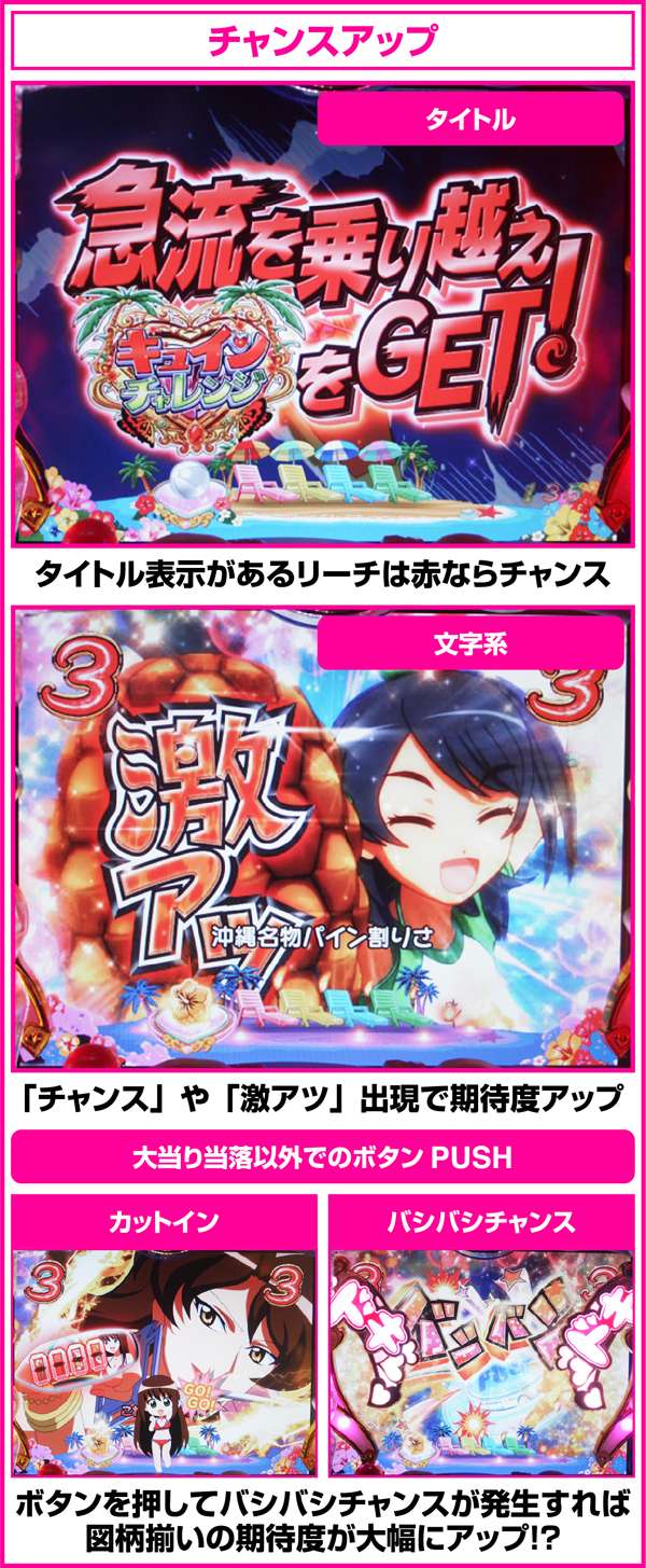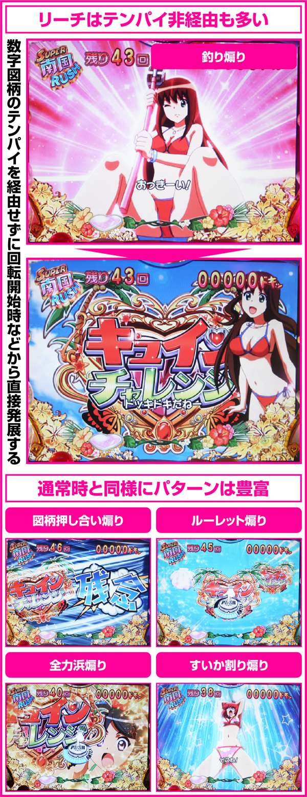 予告のメインが先読みかつリーチ発展までの時間が短めなため、RUSH中はキュインチャレンジ獲得までテンポよく消化できることもポイントだ。