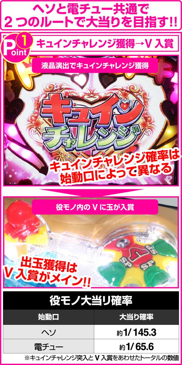 大当りの獲得ルートはキュインチャレンジでのV入賞or液晶における図柄揃いの2つ。