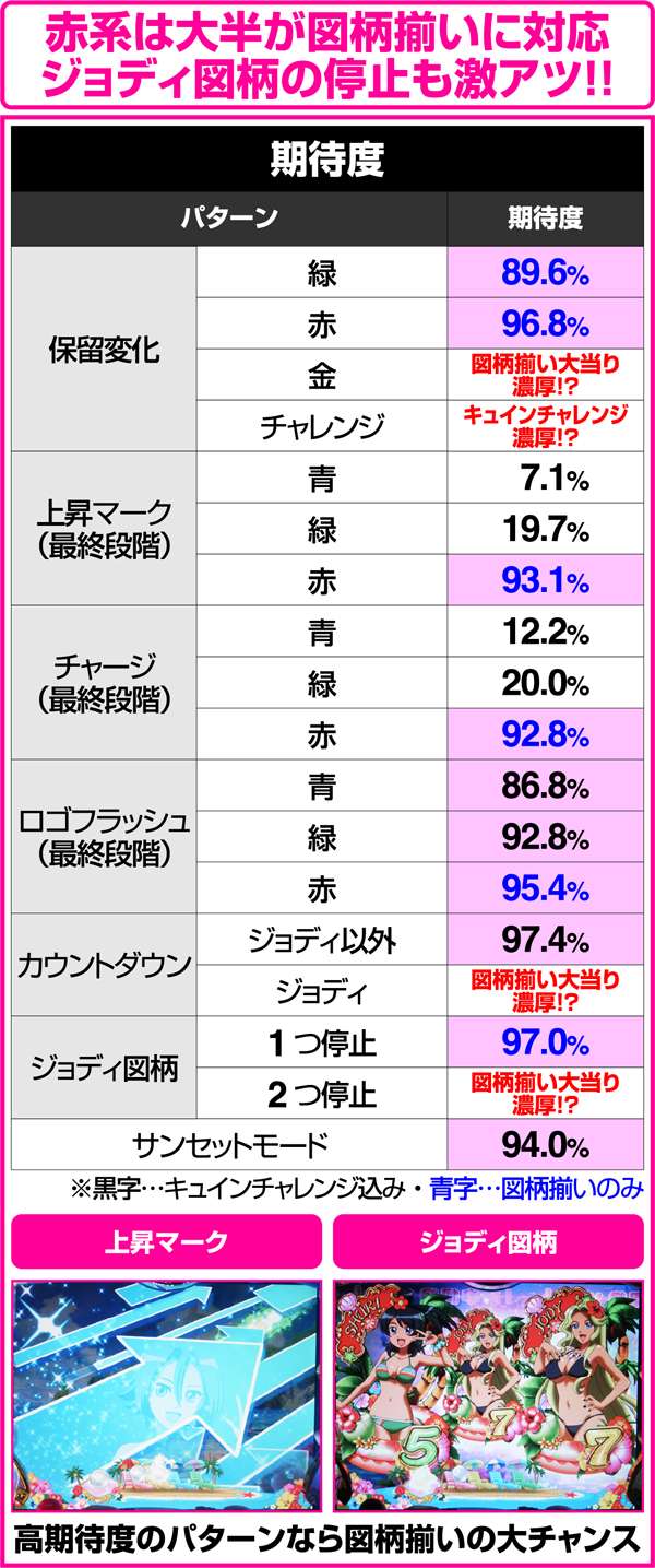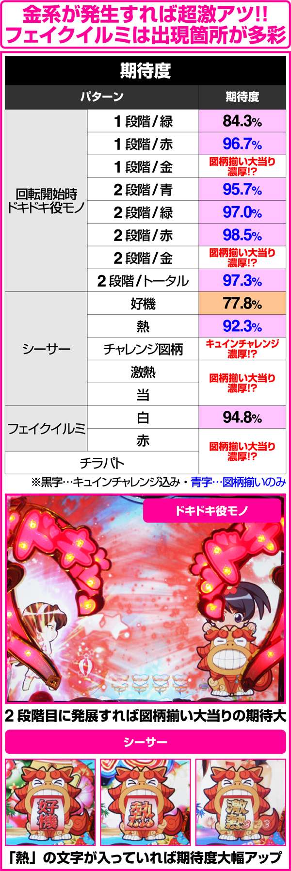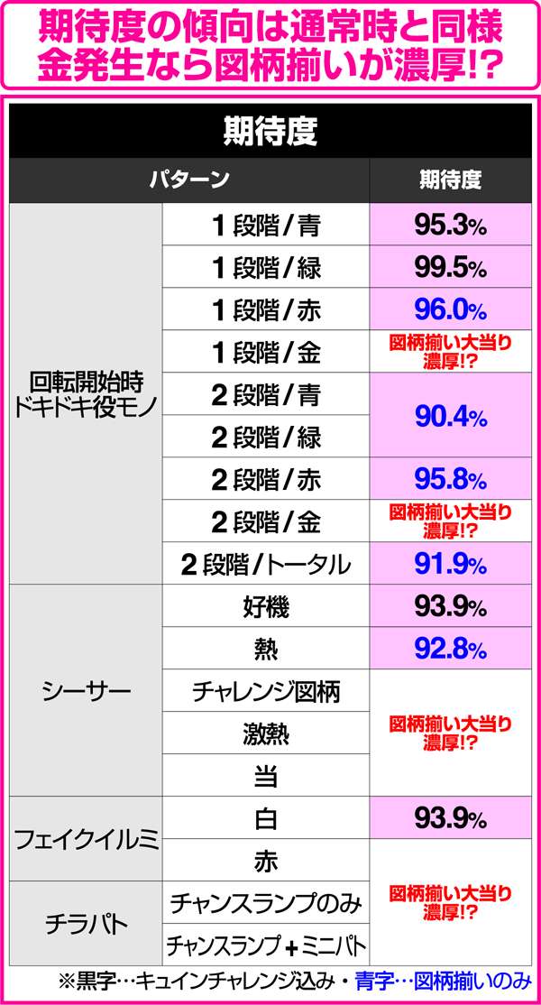 予告共通で、図柄揃いに期待ができるパターン(期待度表では青字の数値)は、キュインチャレンジ図柄が停止した場合でも必ず図柄揃いに昇格。