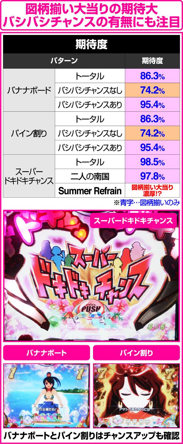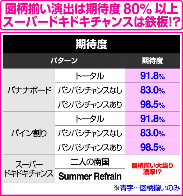 バナナボートやパイン割り、スーパードキドキチャンスなど、テンパイ図柄が表示されているリーチなら図柄揃い大当りのチャンス。