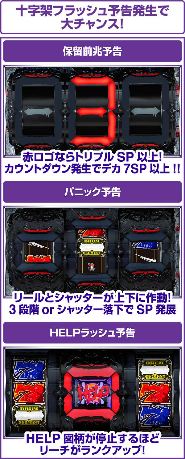 HELPラッシュ予告は左右リールにDANGER図柄停止後、中リールにHELP図柄停止で発展。HELP図柄が連続で停止するほど、SPリーチがランクアップする仕組みだ。