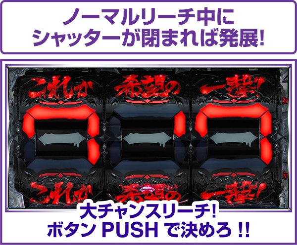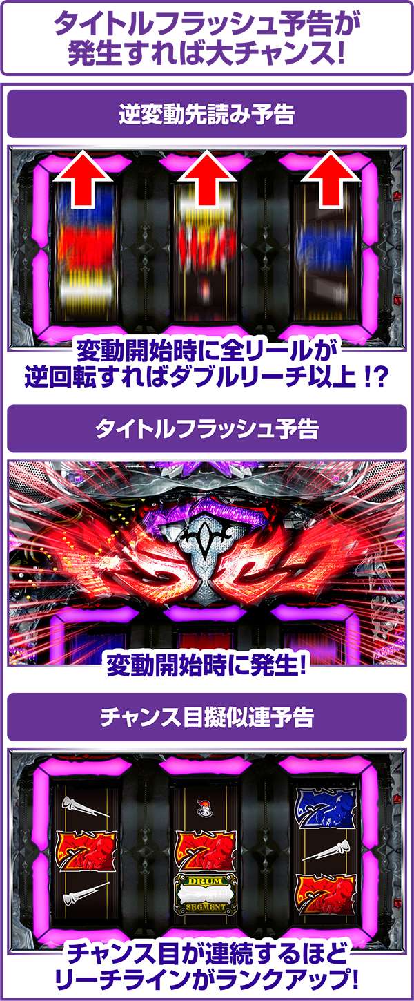 また、ノーマルリーチがハズれても、保留が減らずに次変動が開始するリーチ擬似連続予告も搭載。4回連続すれば大当り濃厚となる!?